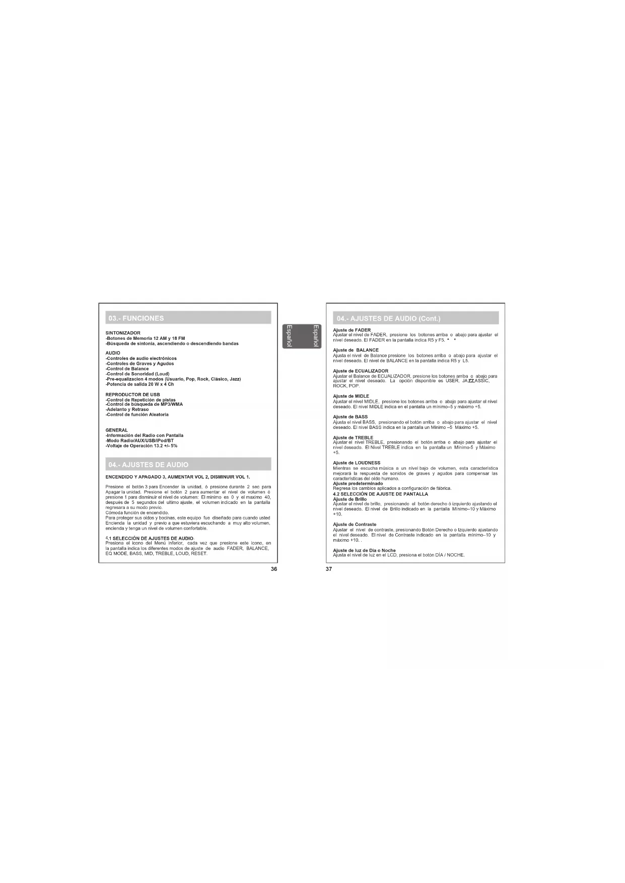 Presiona el icono del Menú inferior, cada vez que presione este icono, en la pantalla indica los diferentes modos de ajuste de audio FADER, BALANCE, EQ MODE, BASS, MID, TREBLE, LOUD, RESET. 03.- FUNCIONES SINTONIZADOR -Botones de Memoria 12 AM y 18 FM -Búsqueda de sintonía, ascendiendo o descendiendo bandas AUDIO -Controles de audio electrónicos -Controles de Graves y Agudos -Control de Balance -Control de Sonoridad (Loud) -Pre-equalizacion 4 modos (Usuario, Pop, Rock, Clásico, Jazz) -Potencia de salida 20 W x 4 Ch