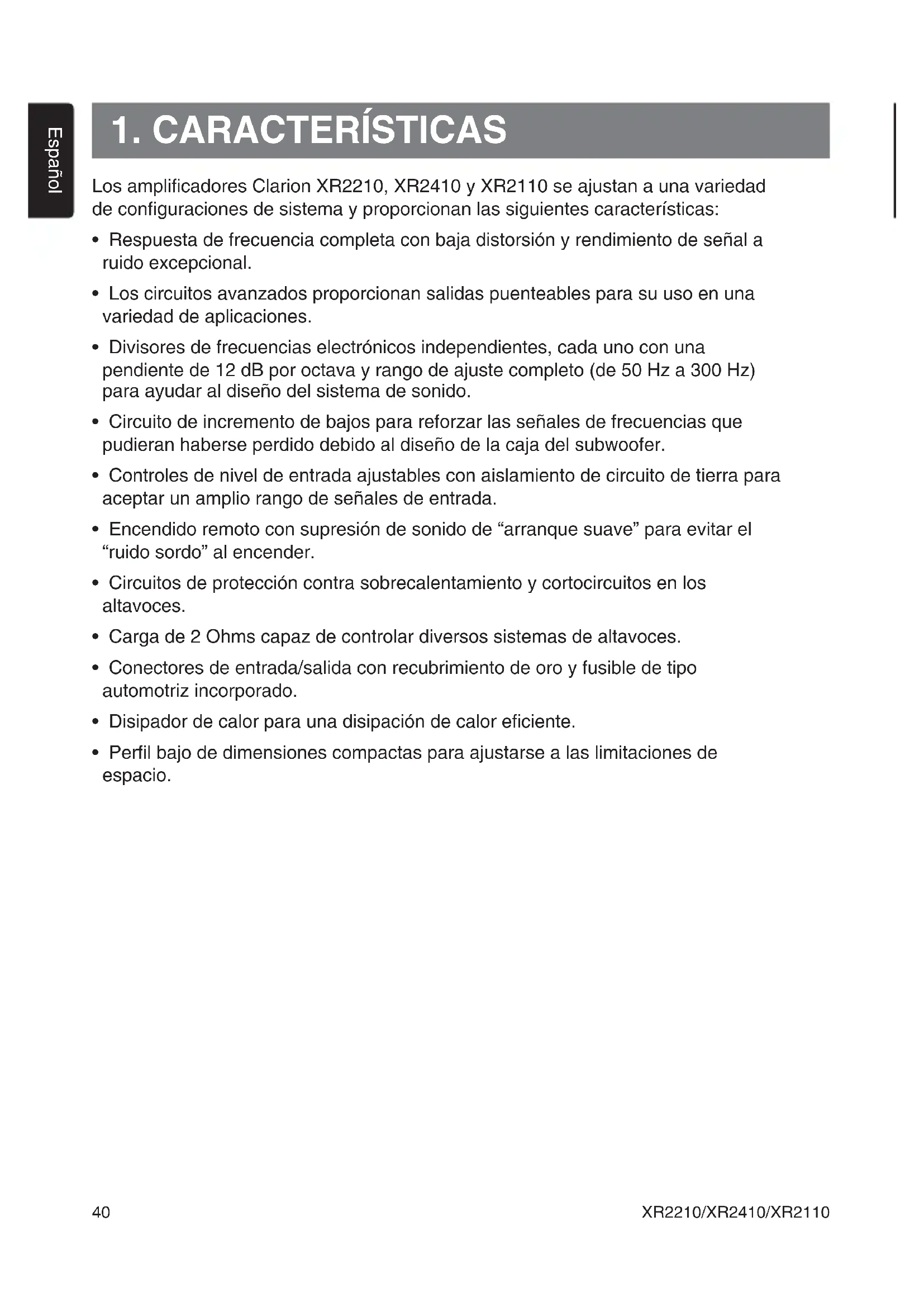 Gracias por adquirir este producto Clarion. Por favor, lea este manual del propietario en su totalidad antes de operar este equipo. Después de leer este manual, consérvelo a la mano, por ejemplo, en la guantera. Guarde su recibo de compra. La garantía al final de este manual y su recibo de compra son indispensables para el servicio de garantía. Aprobación de la FCC Este equipo ha sido probado y cumple con los límites para un dispositivo digital Clase B, en cumplimiento de la Parte 15 de las Reglas de la FCC. Estos límites están diseñados para proporcionar una protección razonable en contra de la interferencia dañina en una instalación residencial. Este equipo genera, utiliza y puede emitir energía de radiofrecuencia y, si nose instala y utiliza según las instrucciones, puede causar interferencia dañina para las comunicaciones de radio. Sin embargo, no existe garantía de que no ocurrirá interferencia en una instalación en particular. Si este equipo causa interferencia dañina a la recepción de radio o televisión, lo cual puede determinarse encendiendo y apagando el equipo, se recomienda al usuario consultar al distribuidor o a un técnico en radio y TV para obtener ayuda. INFORMACIÓN DE REGISTRO DE LOS PRODUCTOS CLARION Para Estados Unidos y Canadá solamente www.clarion.com Estimado cliente: Felicitaciones por haber comprado un producto electrónico móvil Clarion. Estamos seguros de que disfrutará de la experiencia Clarion. Gozará de muchos beneficios al registrar su producto. Para hacerlo, lo invitamos a visitar nuestro sitio web en www.clarion.com. Hemos simplificado el registro de los productos a través de nuestro práctico sitio web. El formulario de registro es breve y fácil de completar. Una vez realizado el trámite, lo podremos mantener informado con las importantes novedades del producto. Regístrese en www.clarion.com : un modo fácil de mantener su producto Clarion actualizado.Español XR2210/XR2410/XR2110 39 Contenido