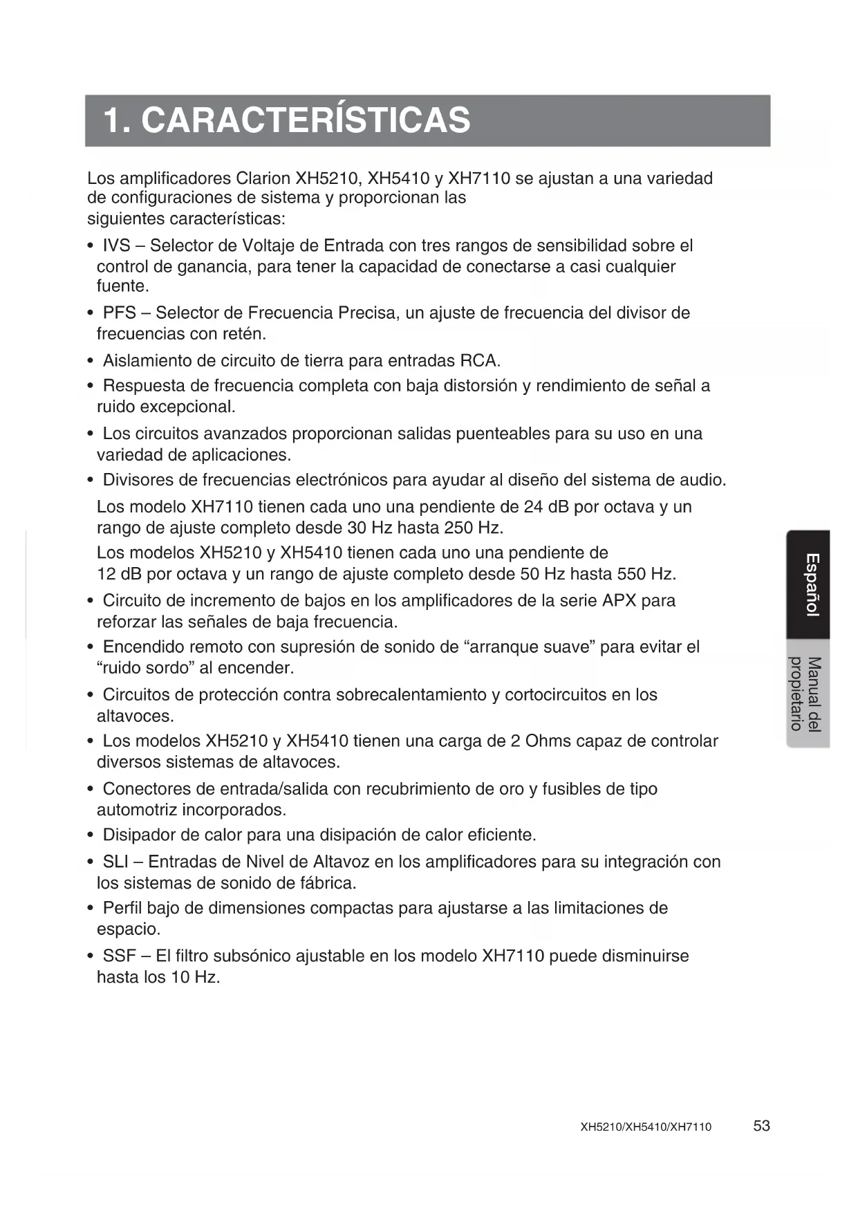 - SSF – El filtro subsónico ajustable en los modelo XH7110 puede disminuirse hasta los 10 Hz.54 XH5210/XH5410/XH7110 Español Manual del propietario