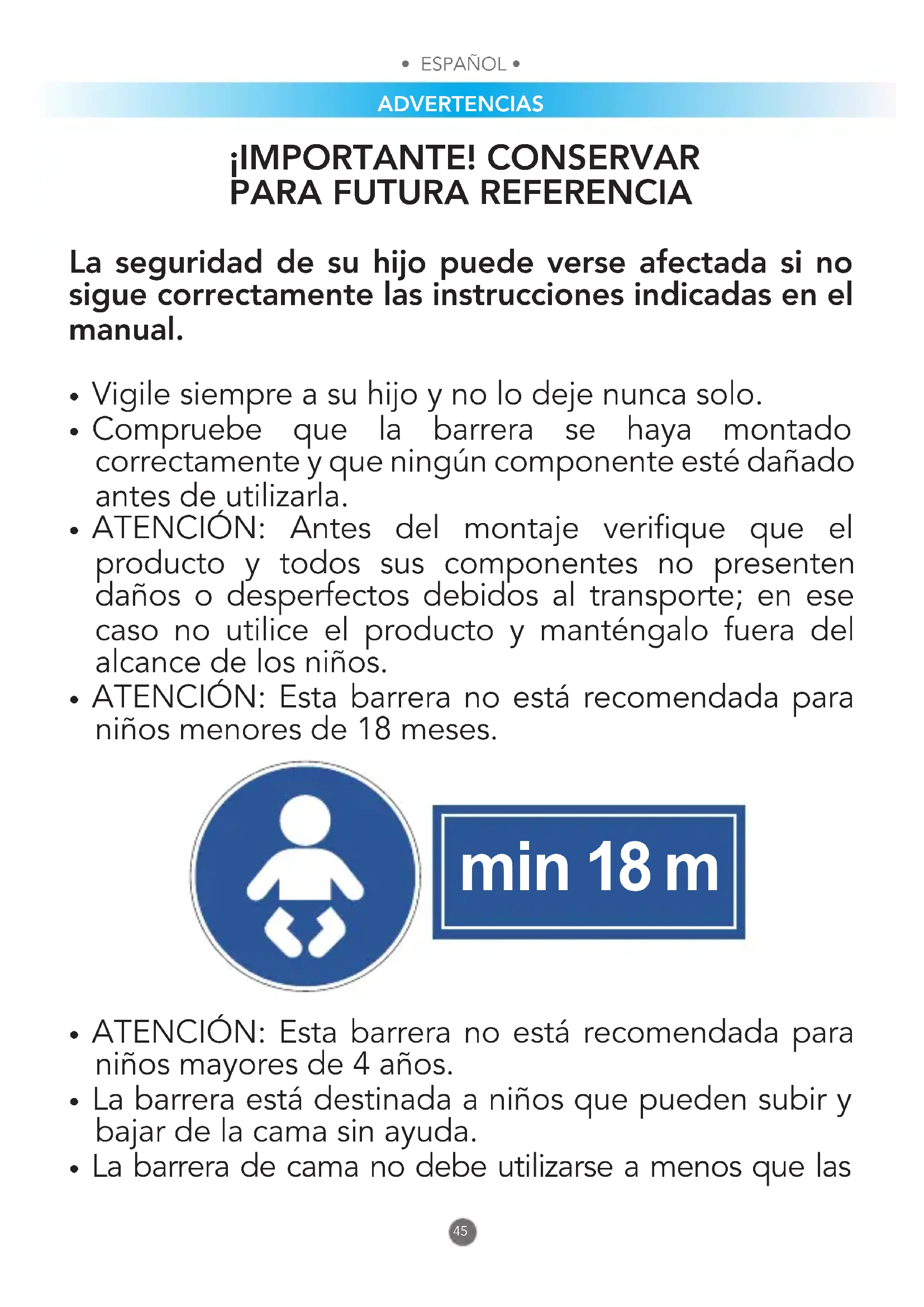 - ATENCIÓN: La barrera no debe utilizarse con más de un colchón, sobre camitas y camitas para utilizar en exteriores.