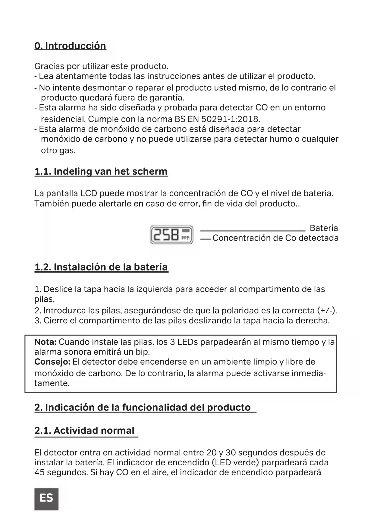 - Inhoud van de doos: Co melder + handleiding + bevestigingskit Support www.chacon.com/support NL0. Introducción Gracias por utilizar este producto. - Lea atentamente todas las instrucciones antes de utilizar el producto. - No intente desmontar o reparar el producto usted mismo, de lo contrario el producto quedará fuera de garantía. - Esta alarma ha sido diseñada y probada para detectar CO en un entorno residencial. Cumple con la norma BS EN 50291-1:2018. - Esta alarma de monóxido de carbono está diseñada para detectar monóxido de carbono y no puede utilizarse para detectar humo o cualquier otro gas. 1.1. Indeling van het scherm La pantalla LCD puede mostrar la concentración de CO y el nivel de batería. También puede alertarle en caso de error, n de vida del producto... 1.2. Instalación de la batería