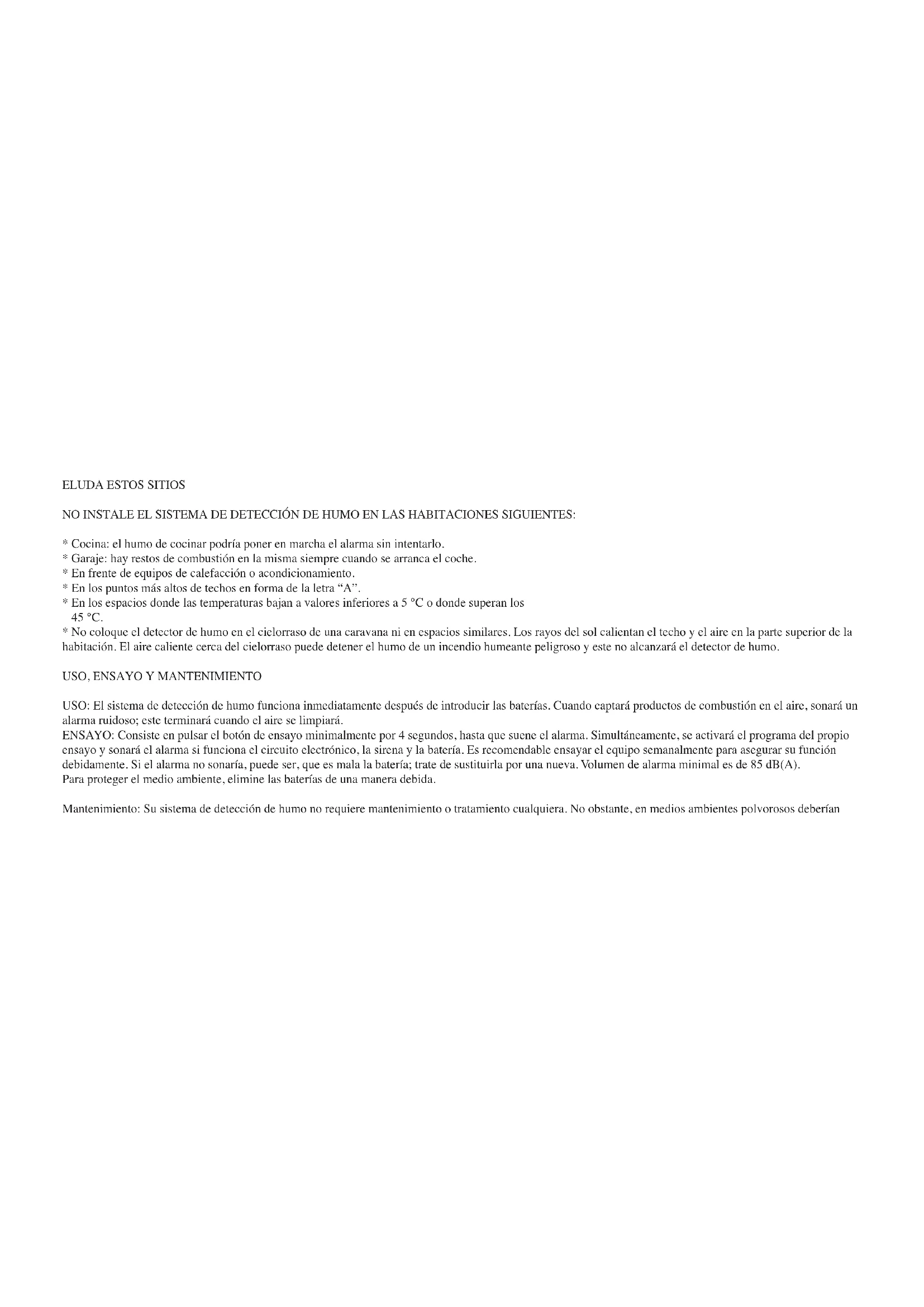 USO: El sistema de detección de humo funciona inmediatamente después de introducir las baterías. Cuando captará productos de combustión en el aire, sonará un alarma ruidoso; este terminará cuando el aire se limpiará. ENSAYO: Consiste en pulsar el botón de ensayo minimalmente por 4 segundos, hasta que suene el alarma. Simultáneamente, se activará el programa del propio ensayo y sonará el alarma si funciona el circuito electrónico, la sirena y la batería. Es recomendable ensayar el equipo semanalmente para asegurar su función debidamente. Si el alarma no sonaría, puede ser, que es mala la batería; trate de sustituirla por una nueva. Volumen de alarma minimal es de 85 dB(A). Para proteger el medio ambiente, elimine las baterías de una manera debida. Mantenimiento: Su sistema de detección de humo no requiere mantenimiento o tratamiento cualquiera. No obstante, en medios ambientes polvorosos deberíanusar un aspirador para remover el polvo de la cámara exterior.