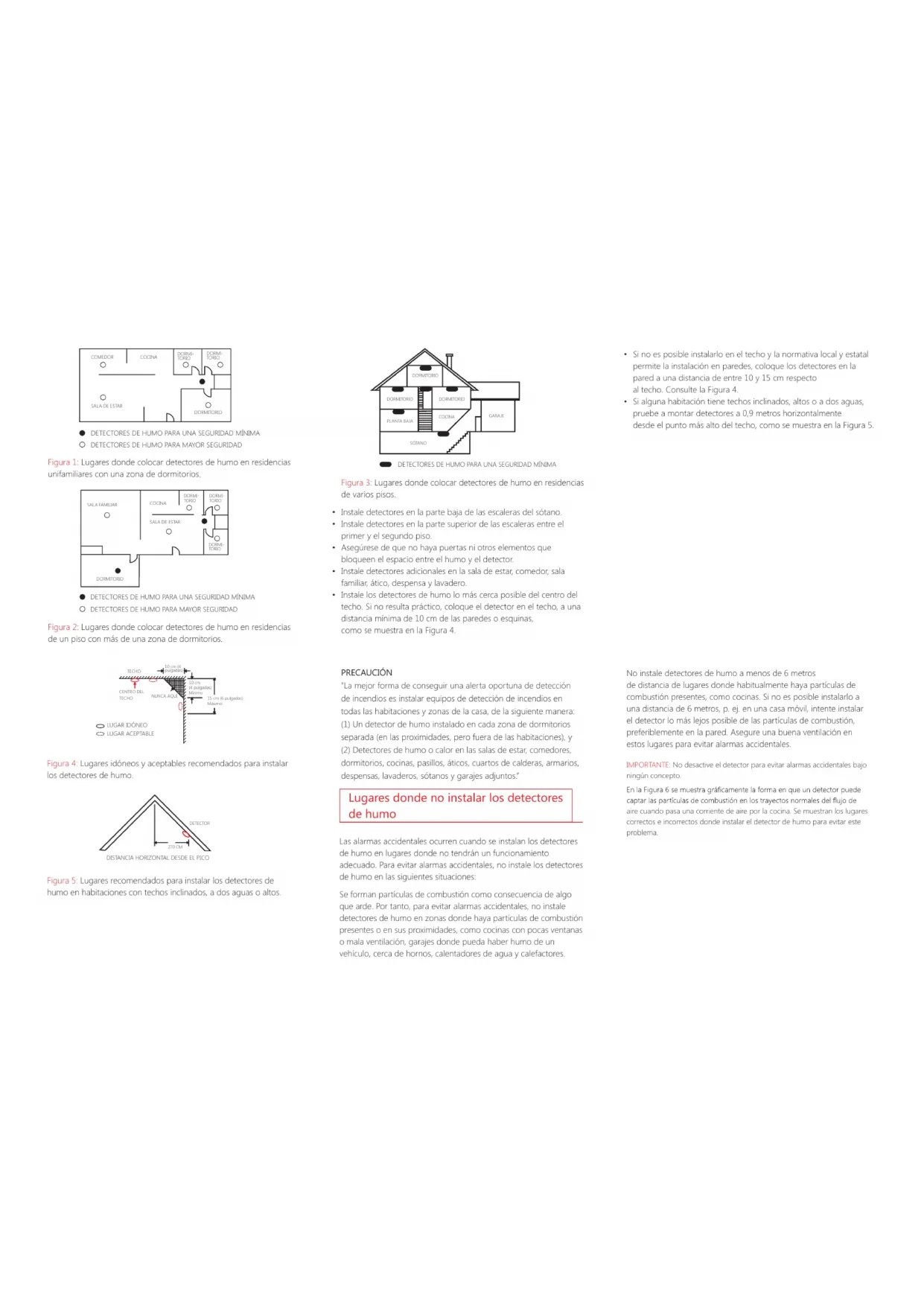 Figura 5: Lugares recomendados para instalar los detectores de humo en habitaciones con techos inclinados, a dos aguas o altos. PRECAUCIÓN "La mejor forma de conseguir una alerta oportuna de detección de incendios es instalar equipos de detección de incendios en todas las habitaciones y zonas de la casa, de la siguiente manera: (1) Un detector de humo instalado en cada zona de dormitorios separada (en las proximidades, pero fuera de las habitaciones), y (2) Detectores de humo o calor en las salas de estar, comedores, dormitorios, cocinas, pasillos, áticos, cuartos de calderas, armarios, despensas, lavaderos, sótanos y garajes adjuntos.” Lugares donde no instalar los detectores de humo Las alarmas accidentales ocurren cuando se instalan los detectores de humo en lugares donde no tendrán un funcionamiento adecuado. Para evitar alarmas accidentales, no instale los detectores de humo en las siguientes situaciones: Se forman partículas de combustión como consecuencia de algo que arde. Por tanto, para evitar alarmas accidentales, no instale detectores de humo en zonas donde haya partículas de combustión presentes o en sus proximidades, como cocinas con pocas ventanas o mala ventilación, garajes donde pueda haber humo de un vehículo, cerca de hornos, calentadores de agua y calefactores. No instale detectores de humo a menos de 6 metros de distancia de lugares donde habitualmente haya partículas de combustión presentes, como cocinas. Si no es posible instalarlo a una distancia de 6 metros, p. ej. en una casa móvil, intente instalar el detector lo más lejos posible de las partículas de combustión, preferiblemente en la pared. Asegure una buena ventilación en estos lugares para evitar alarmas accidentales. IMPORTANTE: No desactive el detector para evitar alarmas accidentales bajo ningún concepto. aire cuando pasa una corriente de aire por la cocina. Se muestran los lugares correctos e incorrectos donde instalar el detector de humo para evitar este problema.RETORNO DE AIRE COCINA