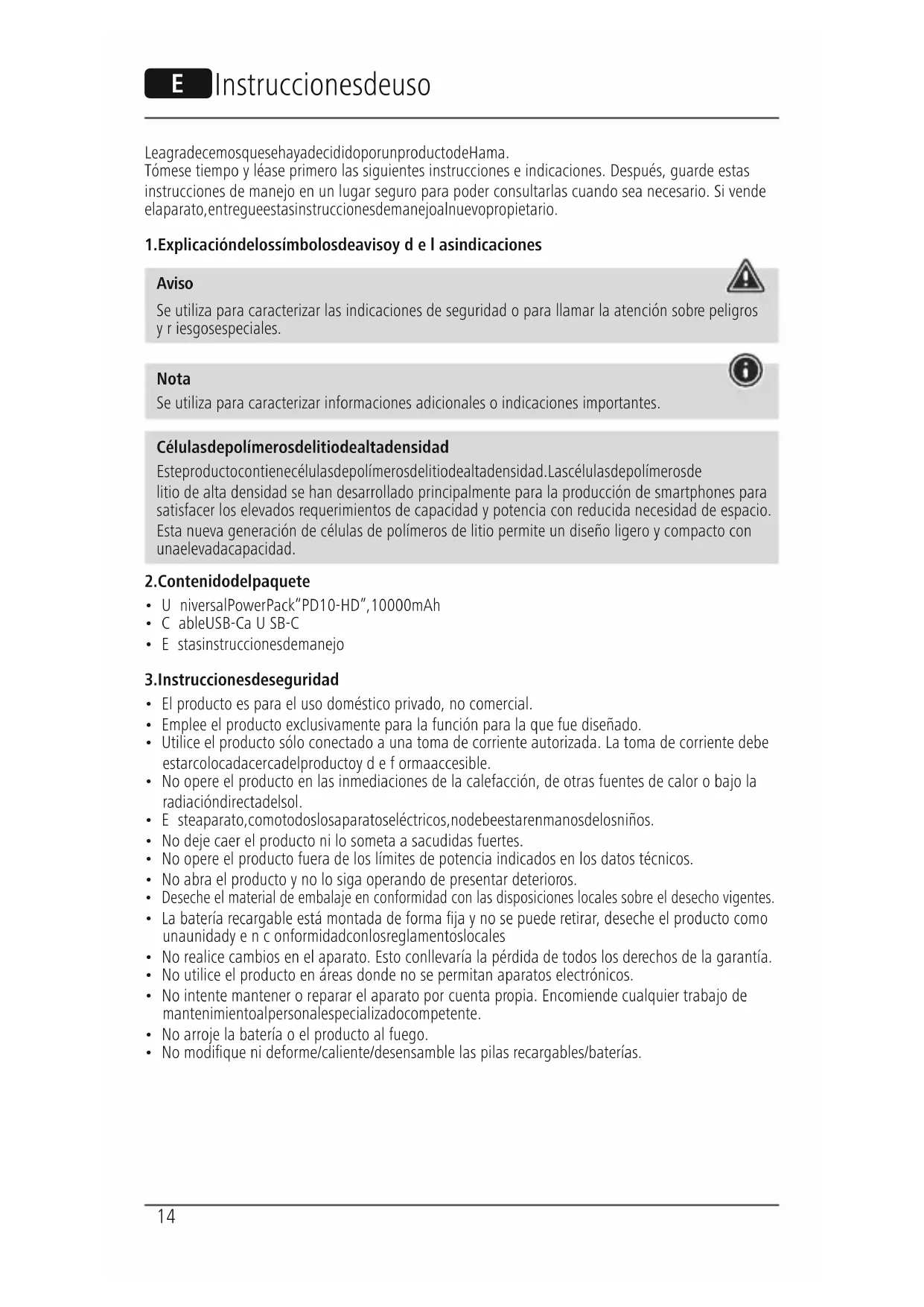 Aviso Se utiliza paracaracterizar las indicaciones de seguridad oparallamar la atención sobrepeligros yriesgos especiales. Nota Se utiliza paracaracterizar informaciones adicionales oindicaciones importantes. Células de polímeros de litio de alta densidad Este producto contiene células de polímeros de litio de alta densidad. Las células de polímeros de litio de alta densidad se han desarrollado principalmente paralaproducción de smartphones para satisfacer los elevados requerimientos de capacidad ypotencia con reducida necesidad de espacio. Esta nueva generación de células de polímeros de litio permite un diseño ligeroycompacto con una elevada capacidad.