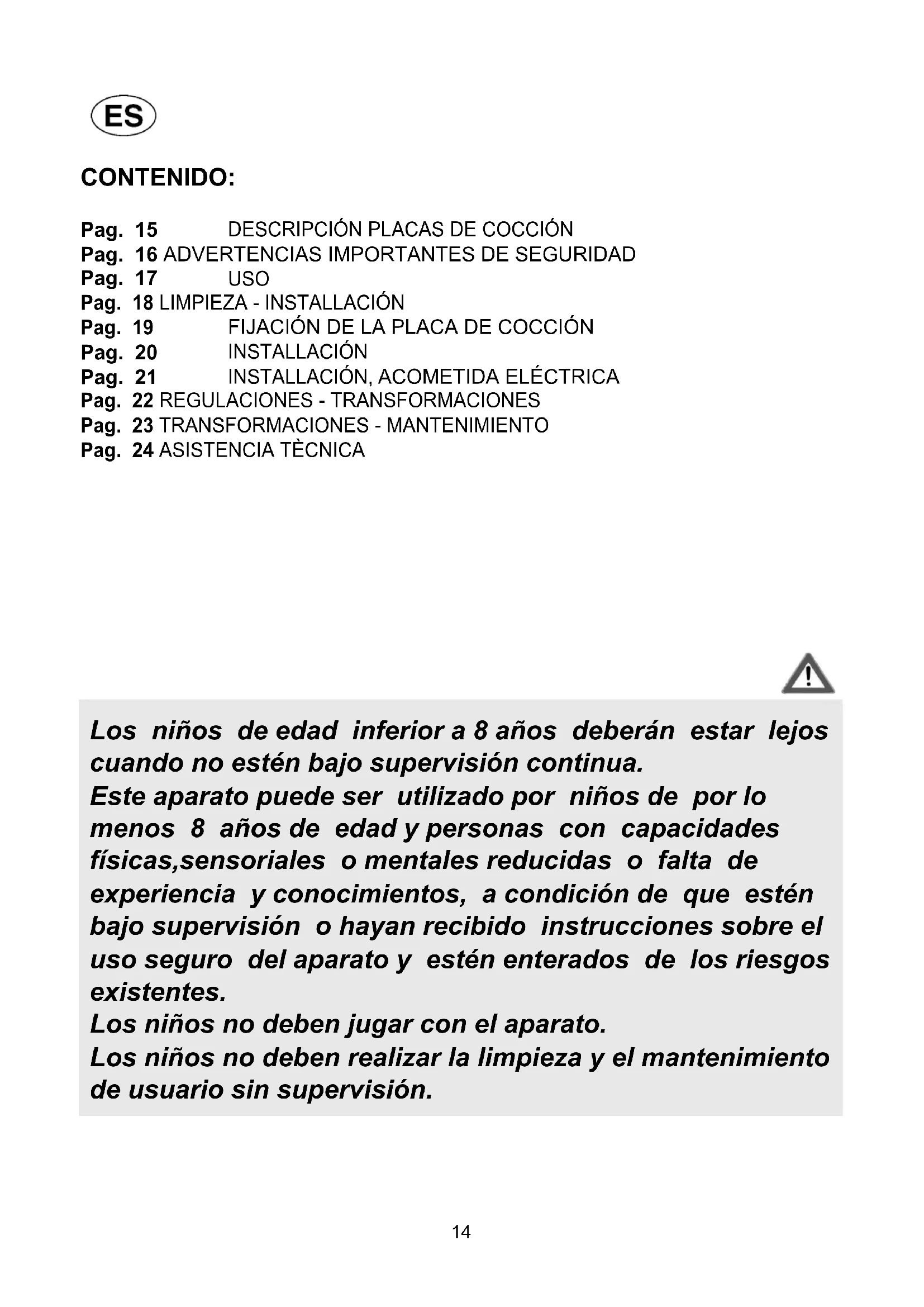 Pag. 16 ADVERTENCIAS IMPORTANTES DE SEGURIDAD Pag. 17 USO Pag. 18 LIMPIEZA - INSTALLACIÓN Pag. 19 FIJACIÓN DE LA PLACA DE COCCIÓN Pag. 20 INSTALLACIÓN Pag. 21 INSTALLACIÓN,