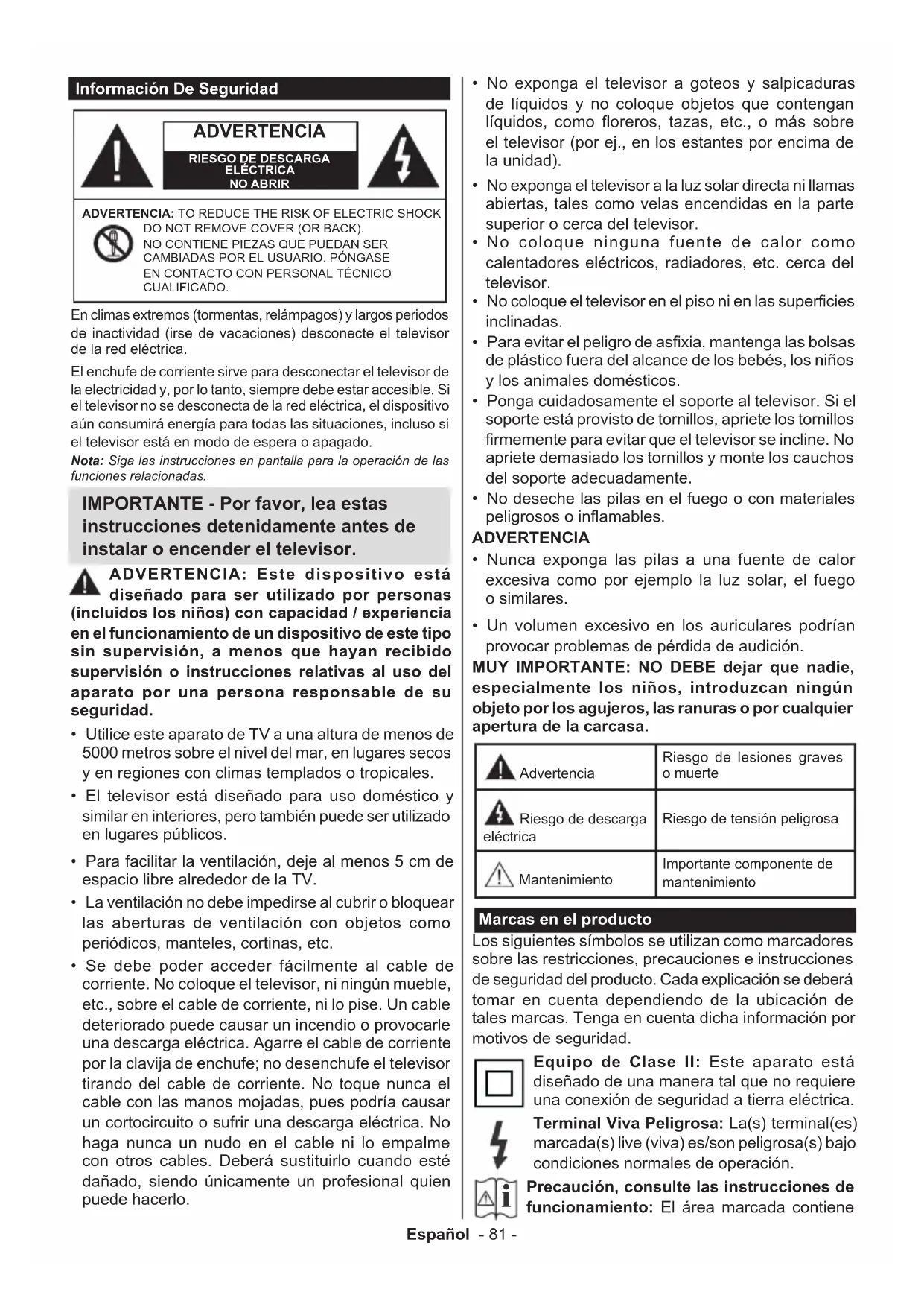 - Un volumen excesivo en los auriculares podrían provocar problemas de pérdida de audición. MUY IMPORTANTE: NO DEBE dejar que nadie, especialmente los niños, introduzcan ningún objeto por los agujeros, las ranuras o por cualquier apertura de la carcasa. Advertencia Riesgo de lesiones graves o muerte Riesgo de descarga eléctrica Riesgo de tensión peligrosa Mantenimiento Importante componente de mantenimiento Marcas en el producto Los siguientes símbolos se utilizan como marcadores sobre las restricciones, precauciones e instrucciones de seguridad del producto. Cada explicación se deberá tomar en cuenta dependiendo de la ubicación de tales marcas. Tenga en cuenta dicha información por motivos de seguridad. Equipo de Clase II: Este aparato está diseñado de una manera tal que no requiere una conexión de seguridad a tierra eléctrica. Terminal Viva Peligrosa: La(s) terminal(es) marcada(s) live (viva) es/son peligrosa(s) bajo condiciones normales de operación.