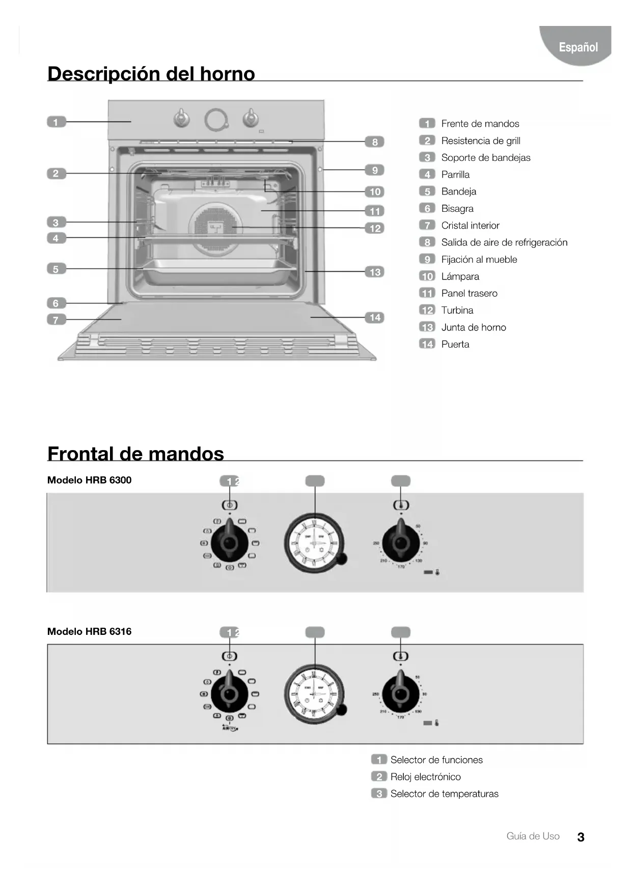 Guía de Uso Símbolos del selector de funciones Funciones del horno INFORMACIÓN Para una descripción de uso de cada una de las funciones, consulte la guía de cocinados incluida en su horno. Modelo HRB 6300 Modelo HRB 6316