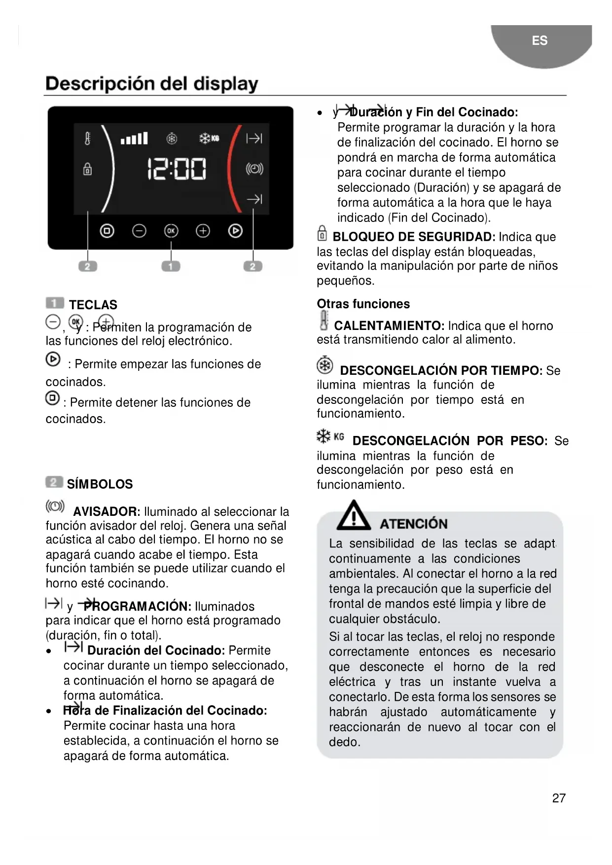 - y Duración y Fin del Cocinado: Permite programar la duración y la hora de finalización del cocinado. El horno se pondrá en marcha de forma automática para cocinar durante el tiempo seleccionado (Duración) y se apagará de forma automática a la hora que le haya indicado (Fin del Cocinado). BLOQUEO DE SEGURIDAD: Indica que las teclas del display están bloqueadas, evitando la manipulación por parte de niños pequeños. Otras funciones CALENTAMIENTO: Indica que el horno está transmitiendo calor al alimento. DESCONGELACIÓN POR TIEMPO: Se ilumina mientras la función de descongelación por tiempo está en funcionamiento. DESCONGELACIÓN POR PESO: Se ilumina mientras la función de descongelación por peso está en funcionamiento. La sensibilidad de las teclas se adapta continuamente a las condiciones ambientales. Al conectar el horno a la red tenga la precaución que la superficie del frontal de mandos esté limpia y libre de cualquier obstáculo. Si al tocar las teclas, el reloj no responde correctamente entonces es necesario que desconecte el horno de la red eléctrica y tras un instante vuelva a conectarlo. De esta forma los sensores se habrán ajustado automáticamente y reaccionarán de nuevo al tocar con el dedo.28