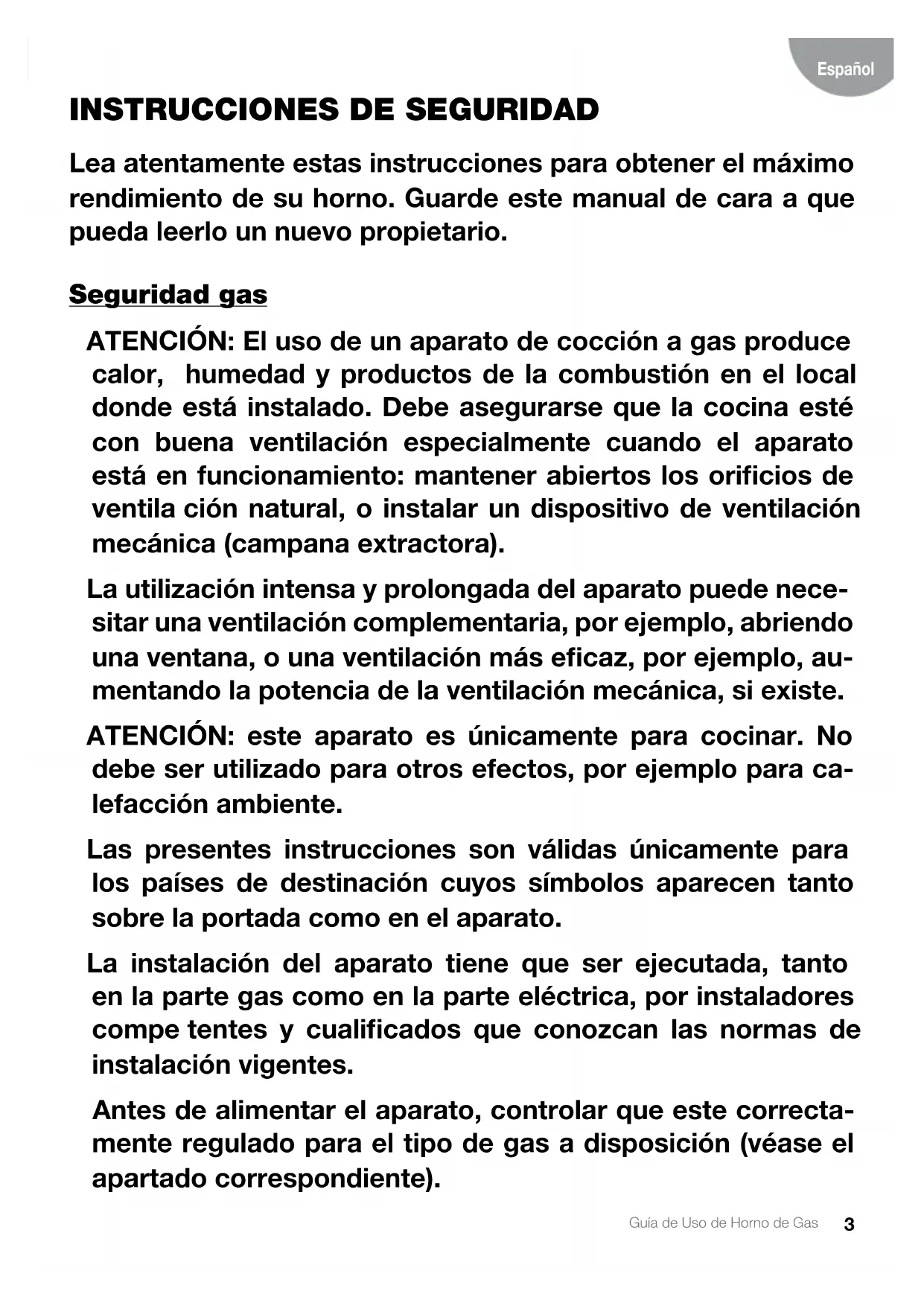 Lea atentamente estas instrucciones para obtener el máximo rendimiento de su horno. Guarde este manual de cara a que pueda leerlo un nuevo propietario. Seguridad gas