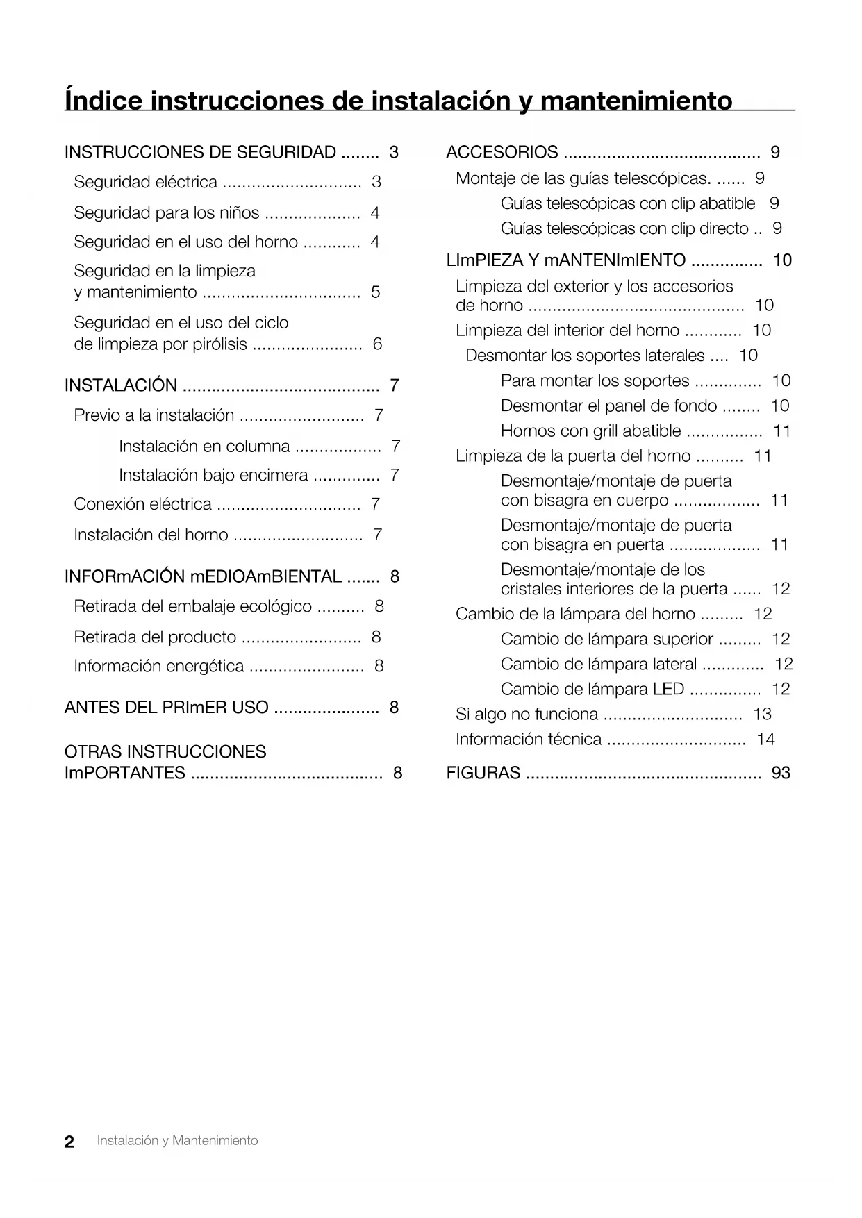 - El horno está dotado de un mecanismo de bloqueo de segu- ridad automático que impedirá la apertura de la puerta du- rante el ciclo de limpieza. No intente abrir la puerta mientras el bloqueo está activado. INFORMACIÓN En este libro se describen características generales de los hornos, por lo que podrían no corresponder exactamente con los de su horno. Para conocer las prestaciones y equi- pamiento específico de su horno, debe consultar la Guía de Uso que acompaña a este manual. El fabricante se reserva el derecho de modificar característi- cas del producto para mejorar el funcionamiento del mismo.7 Instalación y Mantenimiento Español Instalación Esta información va dirigida exclusivamente al instalador, ya que es el responsable del monta- je y conexión eléctrica. Si usted mismo instala el horno, el fabricante no se hará responsable de los posibles daños.