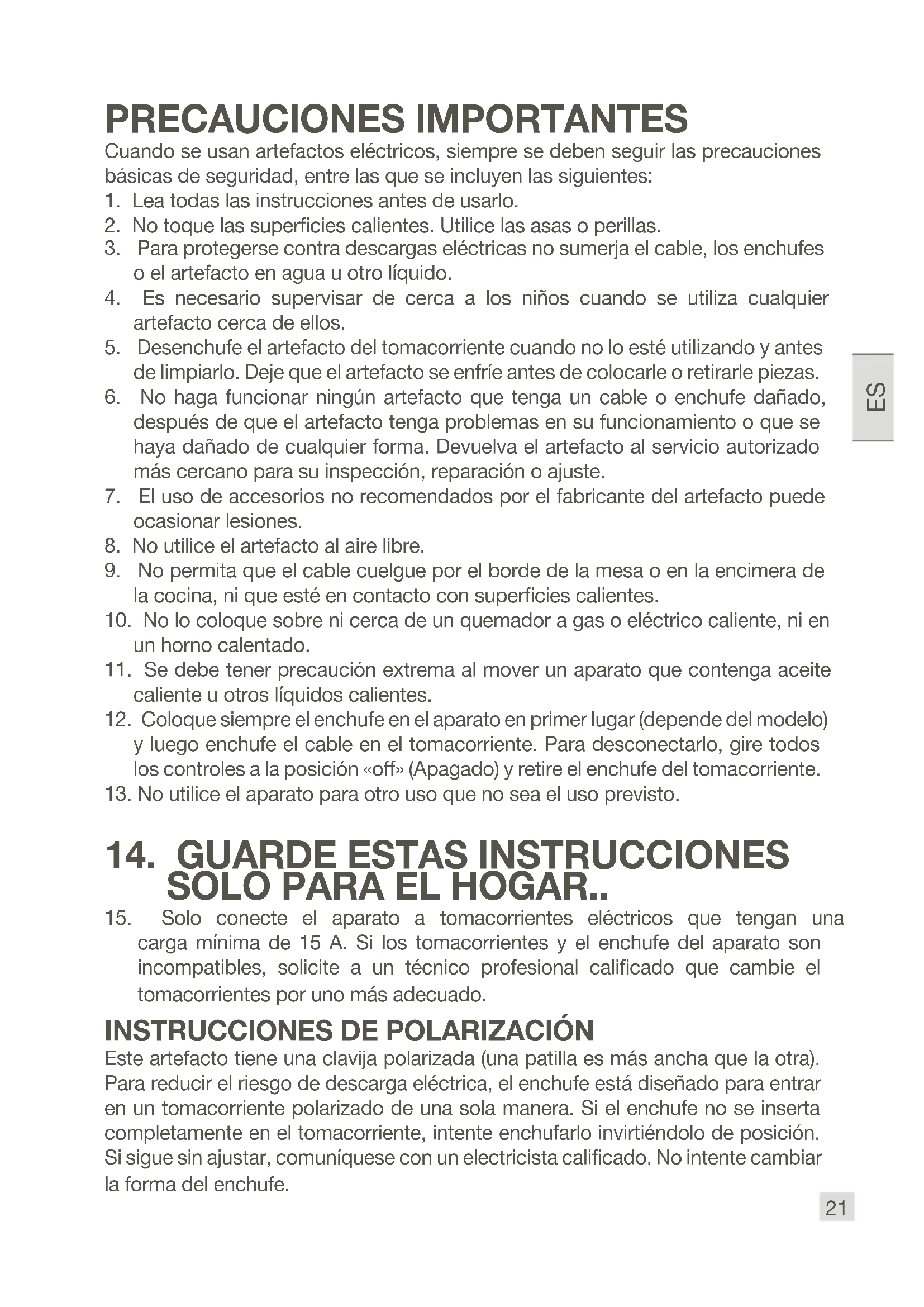 Este artefacto tiene una clavija polarizada (una patilla es más ancha que la otra). Para reducir el riesgo de descarga eléctrica, el enchufe está diseñado para entrar en un tomacorriente polarizado de una sola manera. Si el enchufe no se inserta completamente en el tomacorriente, intente enchufarlo invirtiéndolo de posición. Si sigue sin ajustar, comuníquese con un electricista calicado. No intente cambiar la forma del enchufe.