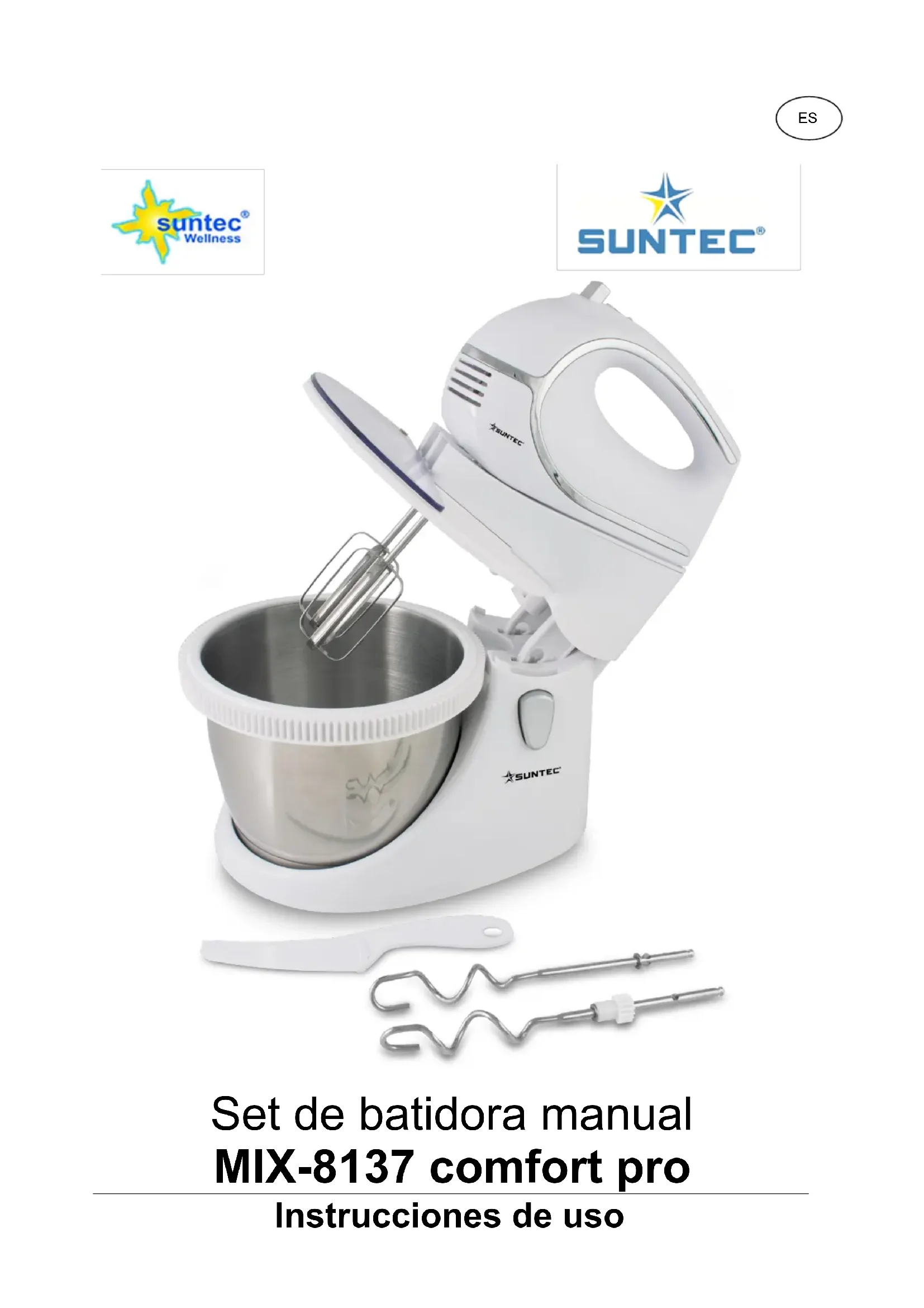 Set de batidora manual MIX-8137 comfort pro Instrucciones de usoLe agradecemos la compra de este aparato de la marca Suntec Wellness. Antes de la primera utilización, por favor lea cuidadosamente el manual. Guardarlo para futuras referencias y al lado de su nuevo propietario, si le da el aparato a otra persona. Indicaciones de seguridad Este aparato puede ser utilizado por niños a partir de 8 años de edad y por personas con capacidades físicas, sensoriales o mentales disminuidas o con experiencia o conocimientos escasos, si lo hacen bajo supervisión o han sido instruidos en el uso seguro del aparato así como en los peligros que entraña. No deje que los niños jueguen con el aparato. La limpieza y el mantenimiento por cuenta del usuario no deben ser realizados por niños sin supervisión. Los niños menores de 3 años que no estén bajo supervisión permanente no deberán poder tener acceso al aparato. Los niños mayores de 3 años y menores de 8, únicamente deberán encender y apagar el aparato cuando este esté situado o instalado en su posición de uso normal, hayan sido instruidos en lo concerniente al uso seguro del aparato, están supervisados y hayan comprendido los posibles riesgos. Los niños mayores de 3 años y menores de 8, no deberán conectar el aparato a la toma de corriente, regularlo, limpiarlo ni realizar su mantenimiento.