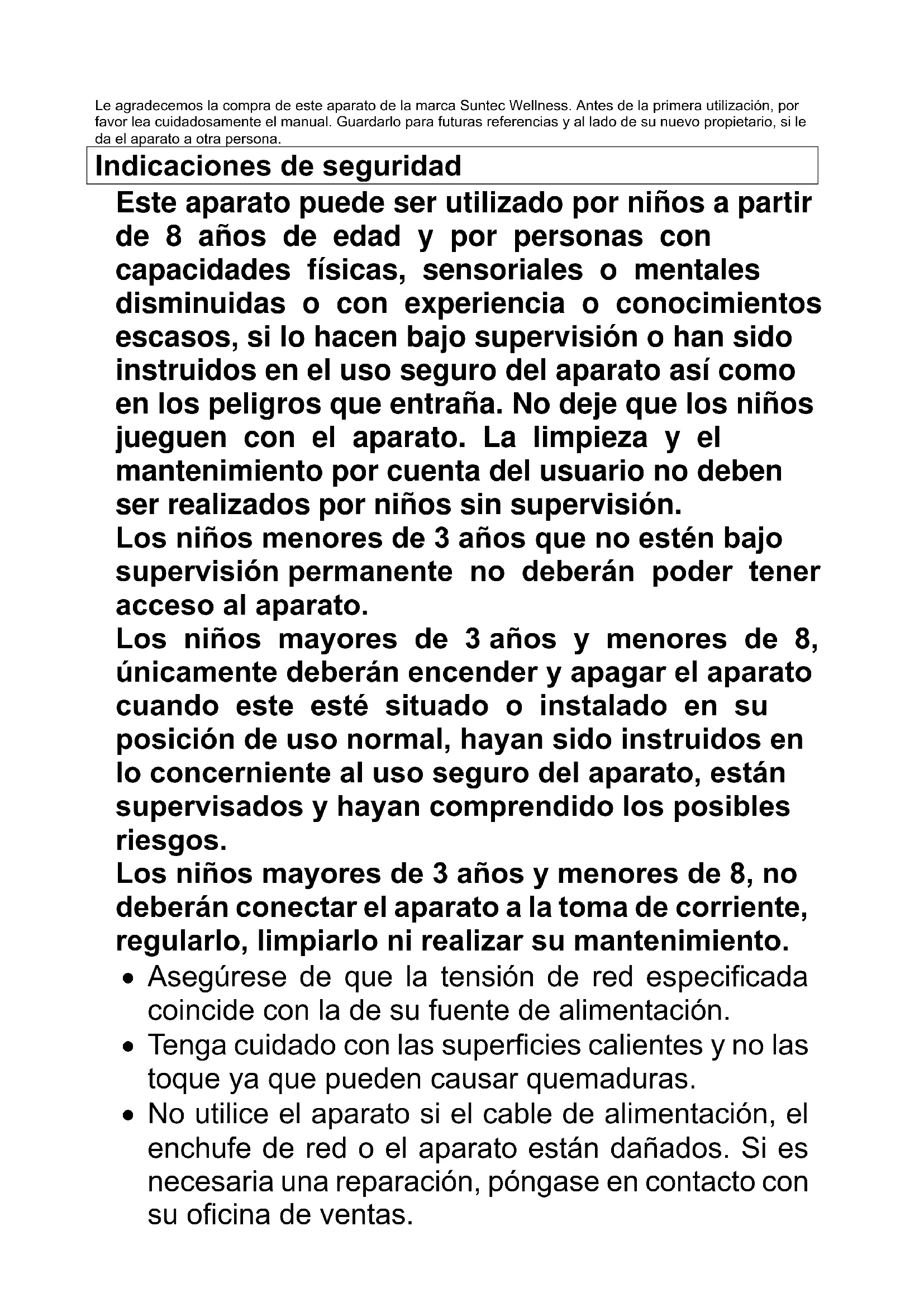 POP-8618 fat free SUNTEC WELLNESS GMBH / HOLZSTRASSE 2 / 40 221 DÜSSELDORF / ALLEMAGNELe agradecemos la compra de este aparato de la marca Suntec Wellness. Antes de la primera utilización, por favor lea cuidadosamente el manual. Guardarlo para futuras referencias y al lado de su nuevo propietario, si le da el aparato a otra persona. Indicaciones de seguridad Este aparato puede ser utilizado por niños a partir de 8 años de edad y por personas con capacidades físicas, sensoriales o mentales disminuidas o con experiencia o conocimientos escasos, si lo hacen bajo supervisión o han sido instruidos en el uso seguro del aparato así como en los peligros que entraña. No deje que los niños jueguen con el aparato. La limpieza y el mantenimiento por cuenta del usuario no deben ser realizados por niños sin supervisión. Los niños menores de 3 años que no estén bajo supervisión permanente no deberán poder tener acceso al aparato. Los niños mayores de 3 años y menores de 8, únicamente deberán encender y apagar el aparato cuando este esté situado o instalado en su posición de uso normal, hayan sido instruidos en lo concerniente al uso seguro del aparato, están supervisados y hayan comprendido los posibles riesgos. Los niños mayores de 3 años y menores de 8, no deberán conectar el aparato a la toma de corriente, regularlo, limpiarlo ni realizar su mantenimiento.