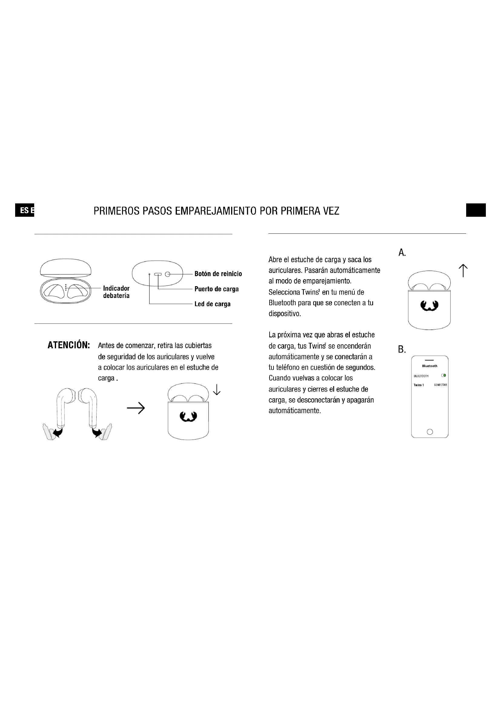 se encenderán automáticamente y se conectarán a tu teléfono en cuestión de segundos. Cuando vuelvas a colocar los auriculares y cierres el estuche de carga, se desconectarán y apagarán automáticamente. Indicador debateríaBotón de reinicioPuerto de cargaLed de cargaCONECTAR