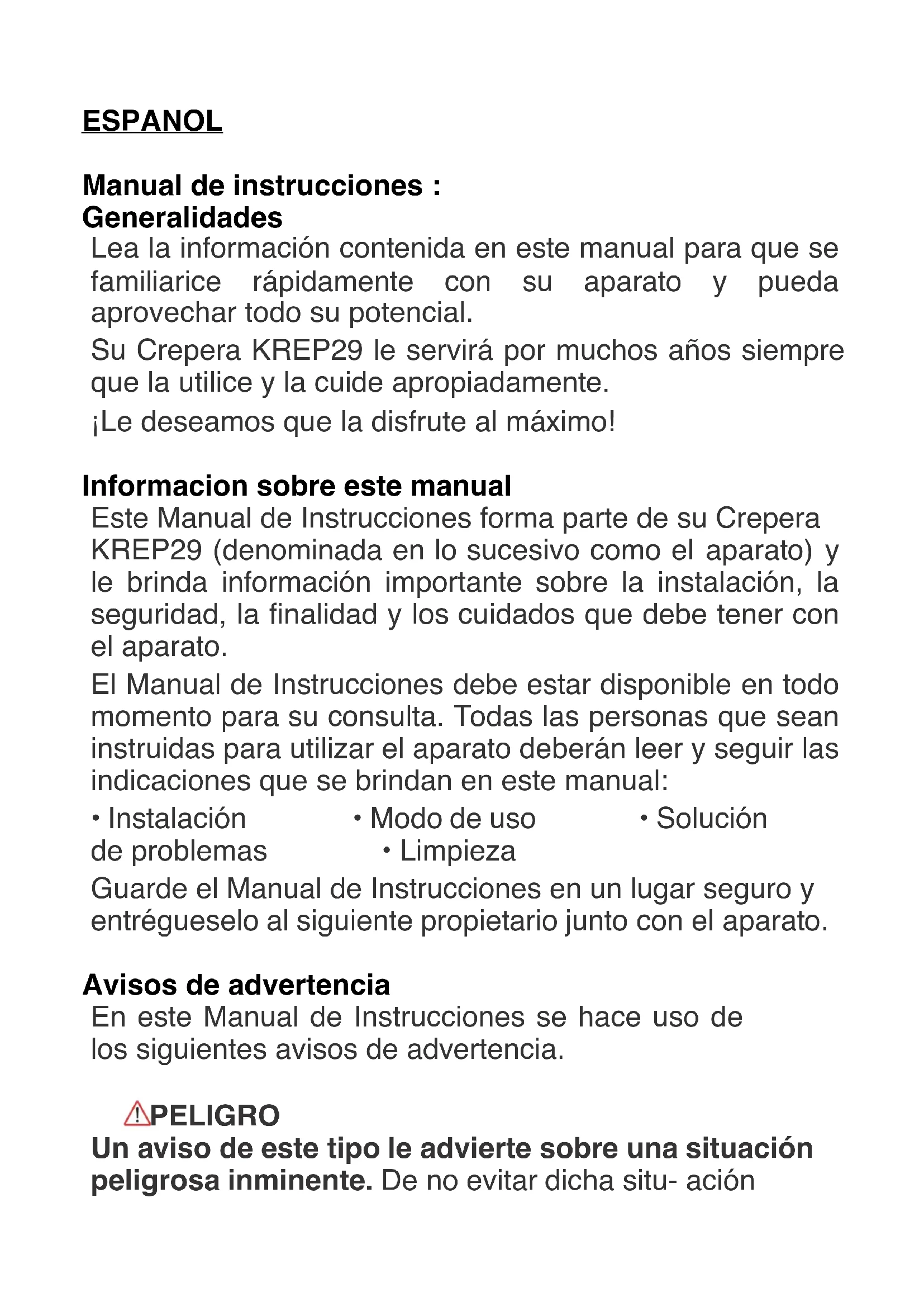 - Accesorios y piezas de desgaste (*). - Mantenimiento normal del aparato. - Todas las averías derivadas de un uso incorrecto (golpes, incumplimiento de las recomendaciones de alimentación eléctrica, malas condiciones de uso, etc.), de un mantenimiento insuficiente o de un mal uso del aparato, así como del uso de accesorios inadecuados. - Daños de origen externo: incendio, daños por agua, sobrecarga eléctrica, etc. - Cualquier equipo que haya sido desmontado, incluso parcialmente, por personas que no estén autorizadas a hacerlo (en particular el usuario). - Productos cuyo número de serie falte, esté dañado o sea ilegible, lo que no permitiría su identificación. - Productos sujetos a alquiler, demostración o exposición. (*) Algunas piezas de su aparato, conocidas como piezas de desgaste o consumibles, se deterioran con el tiempo y la frecuencia de uso de su aparato. Este desgaste es normal, pero puede acentuarse por las malas condiciones de uso o de mantenimiento de su aparato. Por lo tanto, estas piezas no están cubiertas por la garantía. Los accesorios suministrados con el aparato también están excluidos de la garantía. No se pueden cambiar ni reembolsar. No obstante, algunos accesorios pueden adquirirse directamente en nuestro sitio web: https://sav.hkoenig.com/Madio Ambiente ATENCIÓN: No se deshaga de este producto como lo hace con otros productos del hogar. Existe un sistema selectivo de colecta de este producto puesto en marcha por las comunidades, debe de informarse en su ayuntamiento acerca de los lugares en los que puede depositar este producto. De hecho, los productos eléctricos y electrónicos pueden contener substancias peligrosas que tienen efectos nefastos para el medio ambiente o para la salud humana y deben ser reciclados. El símbolo aquí presente indica que los equipos eléctricos o electrónicos deben de ser cuidadosamente seleccionados, representa un recipiente de basura con ruedas marcado con una X. Adeva SAS / H.Koenig Europe - 8 rue Marc Seguin, 77290 Mitry-Mory, France www.hkoenig.com - https://sac.hkoenig.com - Tél: +33 1 64 67 00 05ITALIANO Manual de instrucciones : Generale Si prega di leggere le informazioni contenute in questo documento in modo da poter acquisire familiarità con il tuo dispositivo in modo rapido e sfruttare l’intera gamma delle sue funzioni. Il tuo Crepes Maker KREP29 funzionerà per molti anni se lo si gestisce propriamente. Vi auguriamo un piacevole utilizzo! Le informazioni su questo manuale Queste istruzioni per l’uso sono una componente del Crepes Maker KREP29 (definito di seguito come il dispositivo) e forniscono informazioni importanti per il primo utilizzo, la sicurezza, la destinazione d’uso e la manutenzione del dispositivo. Le istruzioni d’uso devono essere disponibili in ogni momento sul dispositivo. Questo Manuale op- erativo deve essere letto e messo in pratica da ogni persona che utilizzerà il dispositivo: -Messa in funzione - Operazione - Risoluzione dei problemi e/o - Pulizia Tenere il Manuale d’uso in un luogo sicuro e consegnarlo al successivo proprietario insieme al dispositivo.AVVERTENZE Le seguenti avvertenze sono utilizzate in questo manuale dell’operatore. PERICOLO Un avvertimento di questo livello di pericolo indica una situazione potenzialmente pericolosa. Se la situazione pericolosa non viene evitata, può portare a morte o lesioni gravi.