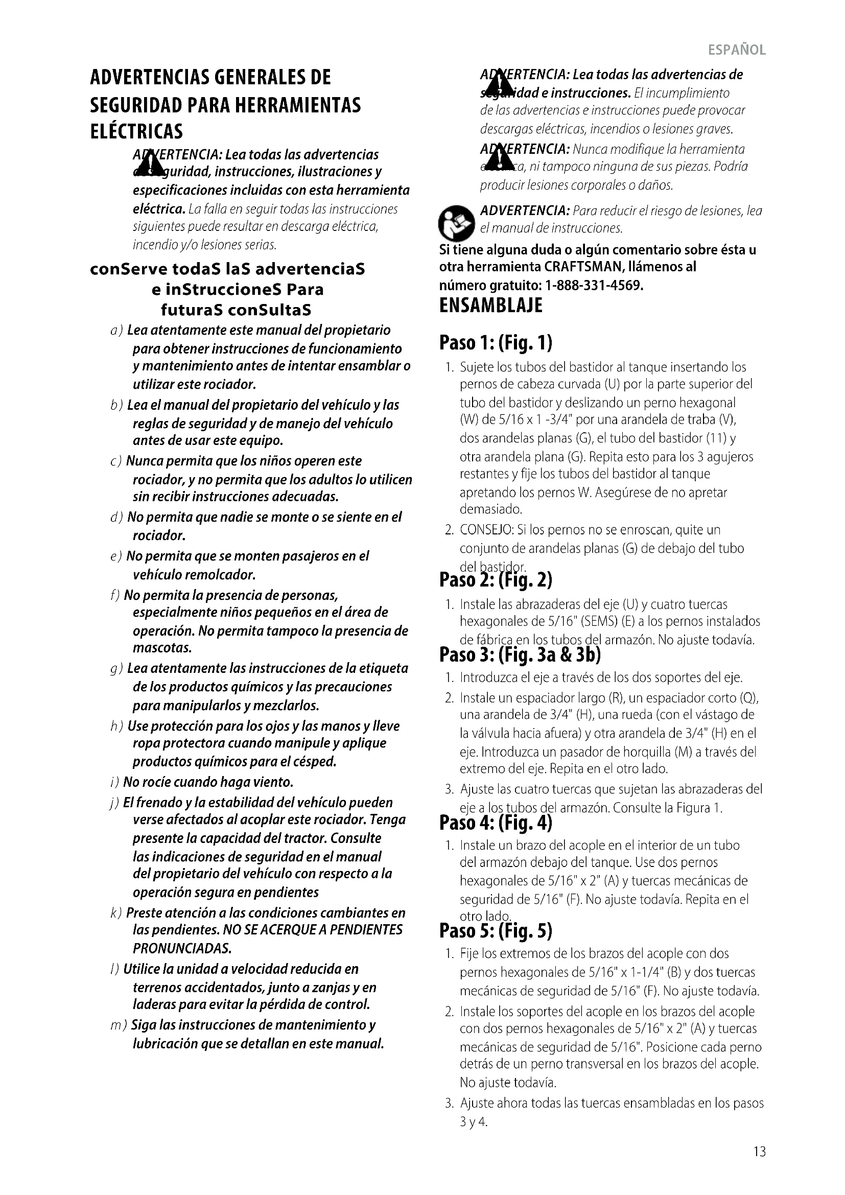 ADVERTENCIA: Nunca modifique la herramienta eléctrica, ni tampoco ninguna de sus piezas. Podría producir lesiones corporales odaños. ADVERTENCIA: Para reducir el riesgo de lesiones, lea el manual deinstrucciones. Si tiene alguna duda o algún comentario sobre ésta u otra herramienta CRAFTSMAN, llámenos al número gratuito: 1-888-331-4569. Paso 2: (Fig. 2)