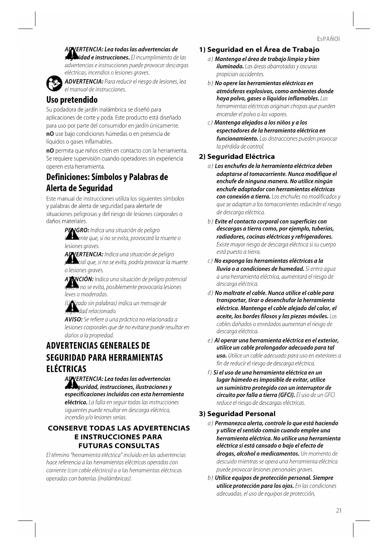 (Utilizado sin palabras) indica un mensaje de seguridadrelacionado. AVISO: Se refiere a una práctica no relacionada a lesiones corporales que de no evitarse puede resultar en daños a lapropiedad. Uso pretendido Su podadora de jardín inalámbrica se diseñó para aplicaciones de corte y poda. Este producto está diseñado para uso por parte del consumidor en jardínúnicamente. nO use bajo condiciones húmedas o en presencia de líquidos o gasesinflamables. nO permita que niños estén en contacto con la herramienta. Se requiere supervisión cuando operadores sin experiencia operen estaherramienta. Español (traducido de las instrucciones originales)