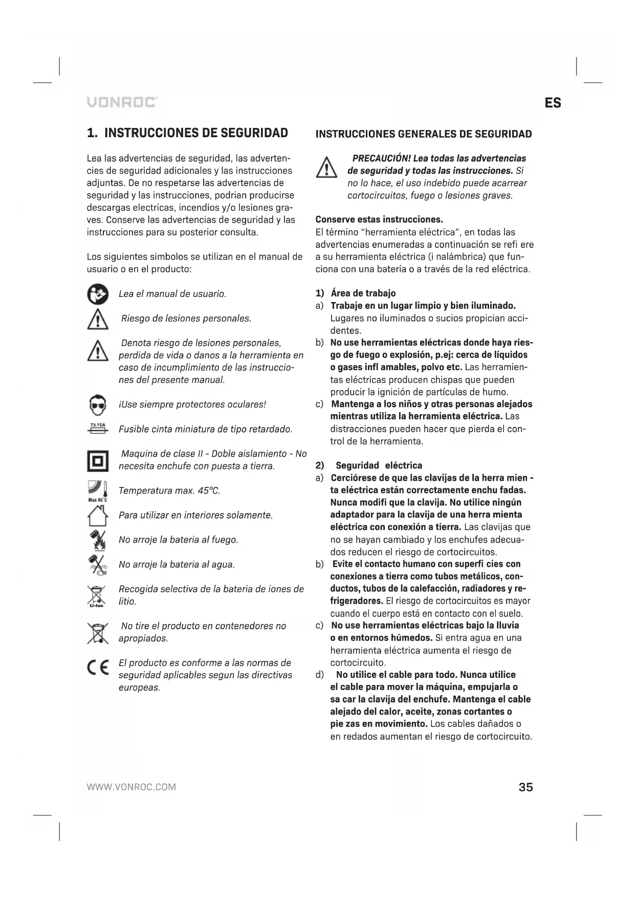 BATERÍA a) No abra la batería. Existe peligro de cortocircuito. b) Proteja la batería del calor, p. ej., de la luz solar intensa continua, los incendios, el agua y la humedad. Peligro de explosión. c) En caso de daño y uso incorrecto de la batería, esta puede emitir vapores. Ventile el área y consulte un médico si se siente mal. Los vapo- res pueden irritar el sistema respiratorio. d) Utilice la batería solo junto con su producto Vonroc. Esta medida protege la batería de sobrecargas peligrosas. e) La batería se puede dañar con objetos puntia- gudos como clavos o destornilladores o si se somete a alguna fuerza exterior. Puede produ- cirse un cortocircuito interno que dé lugar a que la batería se incendie, emita humo, explote o se sobrecaliente.38