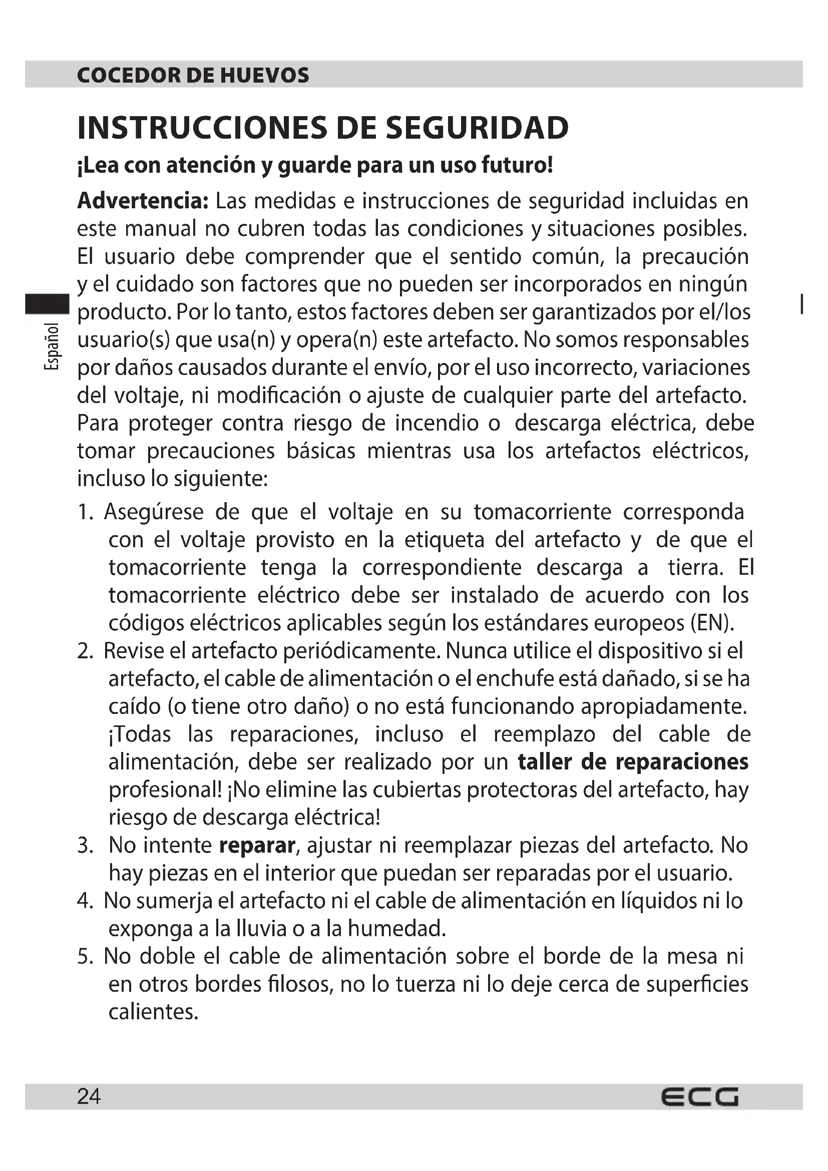 Papel para envolver ycartón corrugado: entregue auna chatarrería. Plástico de embalaje, bolsas de polietileno, elementos plásticos: arrójelos en los recipientes para reciclaje de plásticos. ELIMINACIÓN DE LOS PRODUCTOS AL FINAL DE SU VIDA ÚTIL Eliminación de equipos eléctricos y electrónicos (válido en los países miembros de la Unión Europea yotros países europeos con un sistema implementado de reciclaje) El símbolo representado en el producto oen el embalaje signica que el producto no será tratado como desecho doméstico. Entregue el producto en el sitio especíco para reciclaje de equipos eléctricos yelectrónicos. Evite los efectos negativos en la salud humana yen el medioambiente reciclando apropiadamente su producto. El reciclaje contribuye ala preservación de los recursos naturales. Para más información acerca del reciclaje de este producto, consulte asu autoridad local, organización de procesamiento de desechos domésticos oen la tienda donde compró el producto. Este producto cumple con los requisitos de la directiva de la UE acerca de la compatibilidad electromagnética yseguridad eléctrica. El manual de funcionamiento está disponible en internet en www.ecg-electro.eu. Nos reservamos la posibilidad de realizar cambios en el texto yen los parámetros técnicos. 08/05Français Français