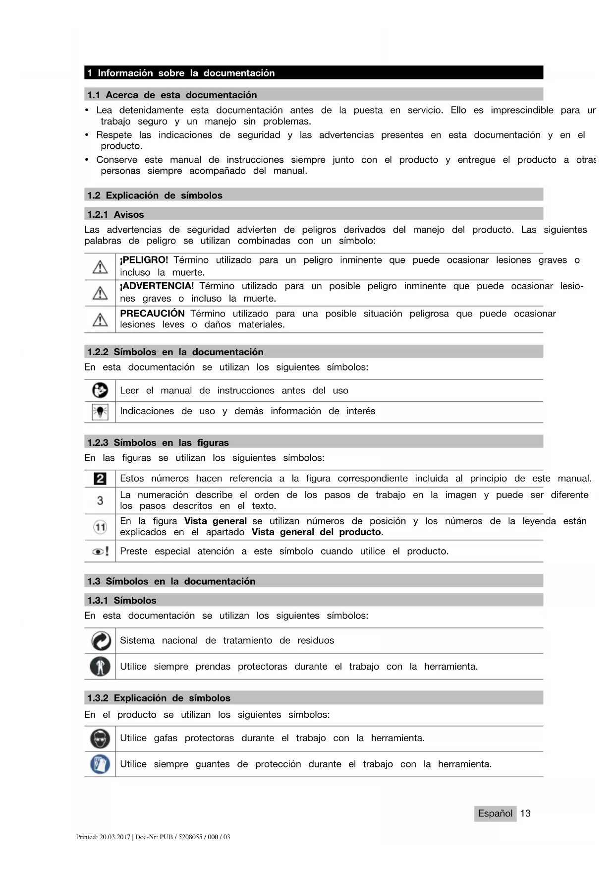 En el producto se utilizan los siguientes símbolos: Utilice gafas protectoras durante el trabajo con la herramienta. Utilice siempre guantes de protección durante el trabajo con la herramienta. Printed: 20.03.2017 | Doc-Nr: PUB / 5208055 / 000 / 0314 Español 2 Seguridad