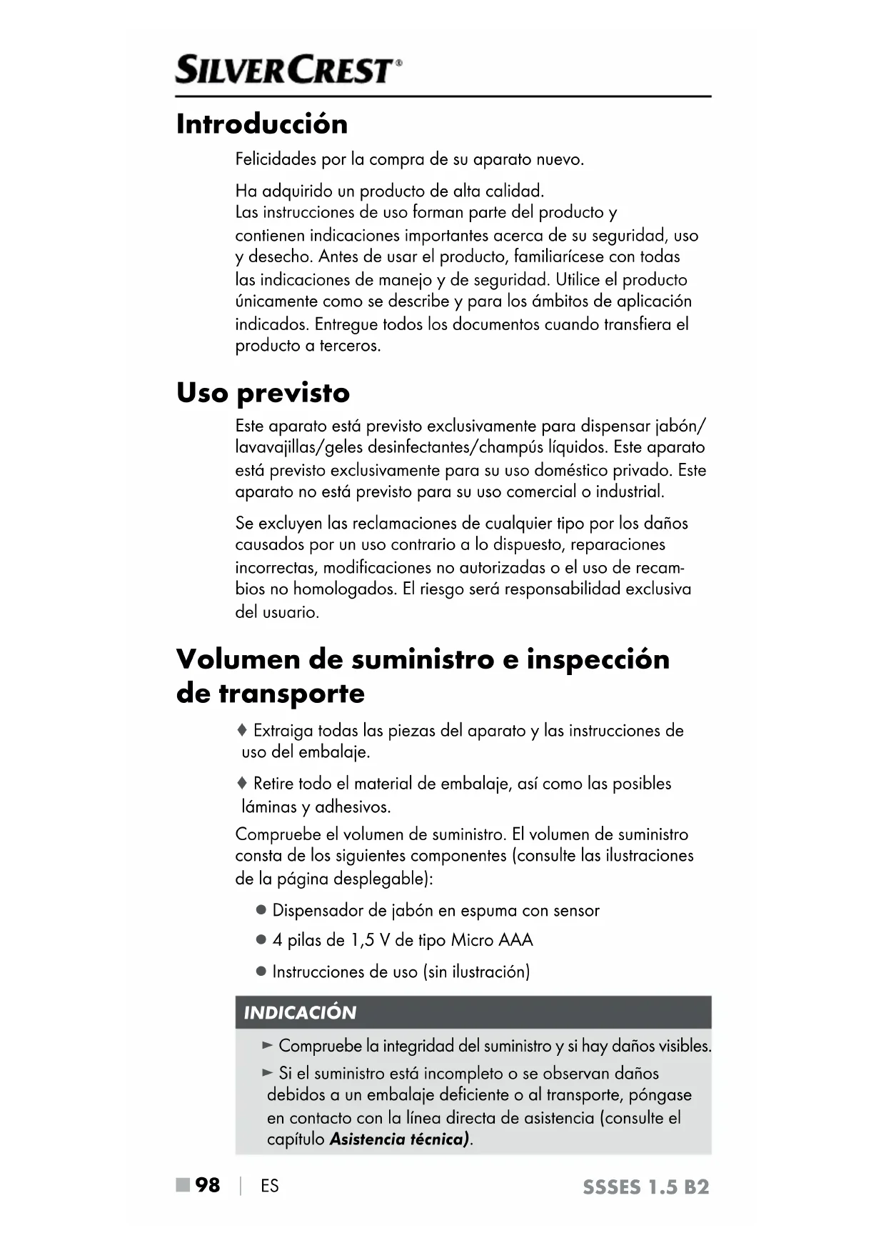 ES SSSES 1.5 B2 Introducción Felicidades por la compra de su aparato nuevo. Ha adquirido un producto de alta calidad. Las instrucciones de uso forman parte del producto y contienen indicaciones importantes acerca de su seguridad, uso y desecho. Antes de usar el producto, familiarícese con todas las indicaciones de manejo y de seguridad. Utilice el producto únicamente como se describe y para los ámbitos de aplicación indicados. Entregue todos los documentos cuando transfiera el producto a terceros. Uso previsto Este aparato está previsto exclusivamente para dispensar jabón/ lavavajillas/geles desinfectantes/champús líquidos. Este aparato está previsto exclusivamente para su uso doméstico privado. Este aparato no está previsto para su uso comercial o industrial. Se excluyen las reclamaciones de cualquier tipo por los daños causados por un uso contrario a lo dispuesto, reparaciones incorrectas, modificaciones no autorizadas o el uso de recam- bios no homologados. El riesgo será responsabilidad exclusiva del usuario. Volumen de suministro e inspección de transporte ♦ Extraiga todas las piezas del aparato y las instrucciones de uso del embalaje. ♦ Retire todo el material de embalaje, así como las posibles láminas y adhesivos. Compruebe el volumen de suministro. El volumen de suministro consta de los siguientes componentes (consulte las ilustraciones de la página desplegable): ▯ Dispensador de jabón en espuma con sensor ▯ 4 pilas de 1,5V de tipo Micro AAA ▯ Instrucciones de uso (sin ilustración) INDICACIÓN ► Compruebe la integridad del suministro y si hay daños visibles. ► Si el suministro está incompleto o se observan daños debidos a un embalaje deficiente o al transporte, póngase en contacto con la línea directa de asistencia (consulte el capítulo Asistencia técnica).ES