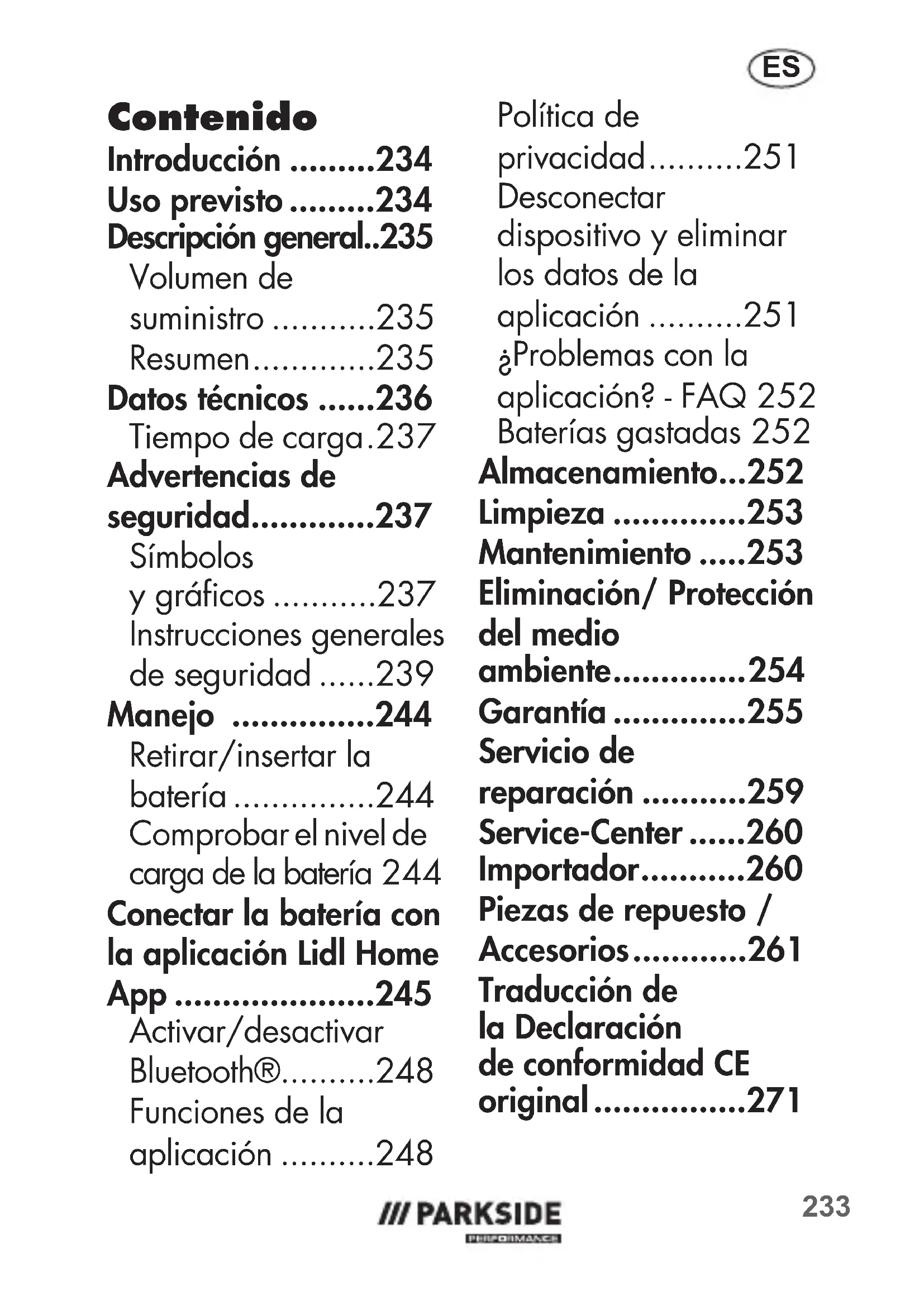 - Eliminación/ Protección del medio ambiente p. 254