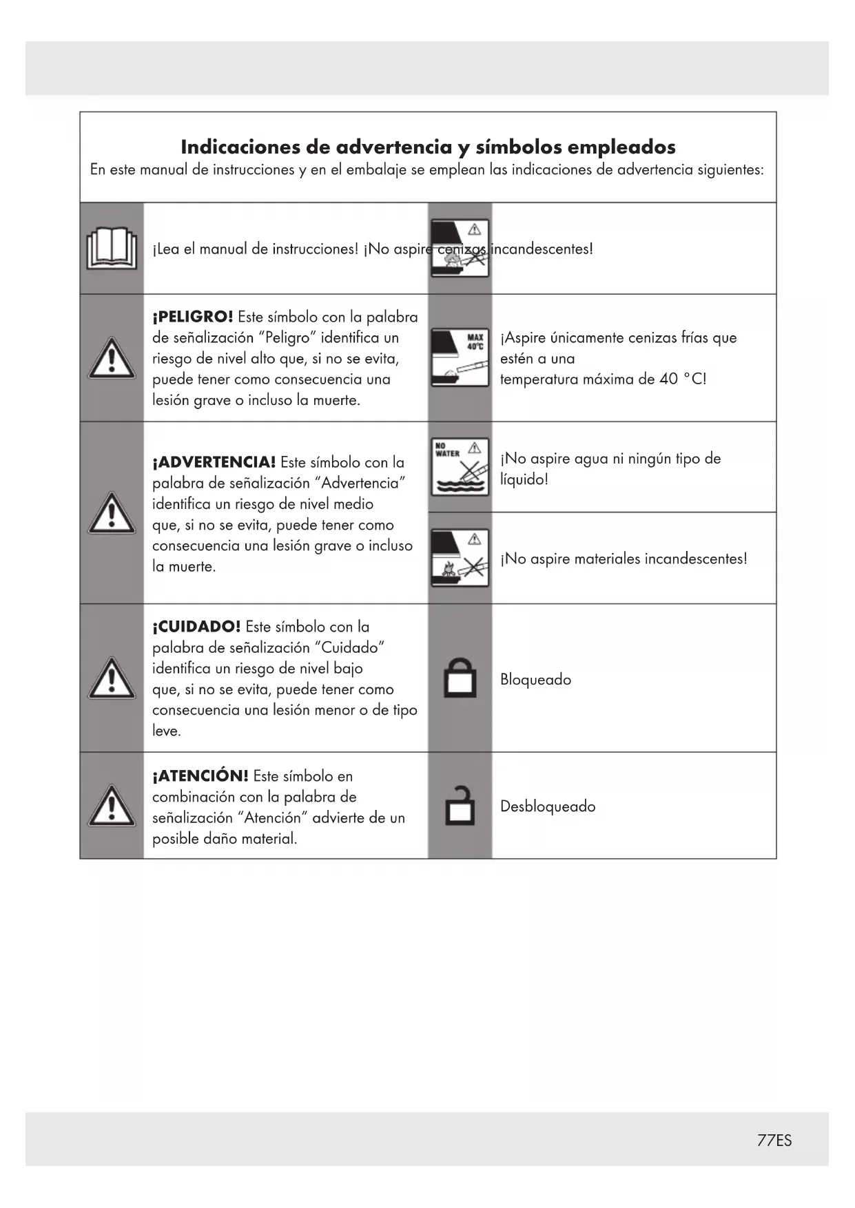 ¡ADVERTENCIA! u ¡Aspire únicamente cenizas de materiales combustibles permitidos! Cualquier otro uso o modificación del producto se considera contrario al uso previsto y puede provocar peligros como la muerte, lesiones corporales y daños materiales. El fabricante no se responsabiliza de los daños producidos por un uso indebido. El producto está destinado exclusivamente al uso doméstico. El producto no está destinado al uso comercial. NOTA u Definición de “aspiradora adecuada”: – Máx. consumo de potencia admisible: 1200W – Máx. caudal volumétrico admisible: 1,4m