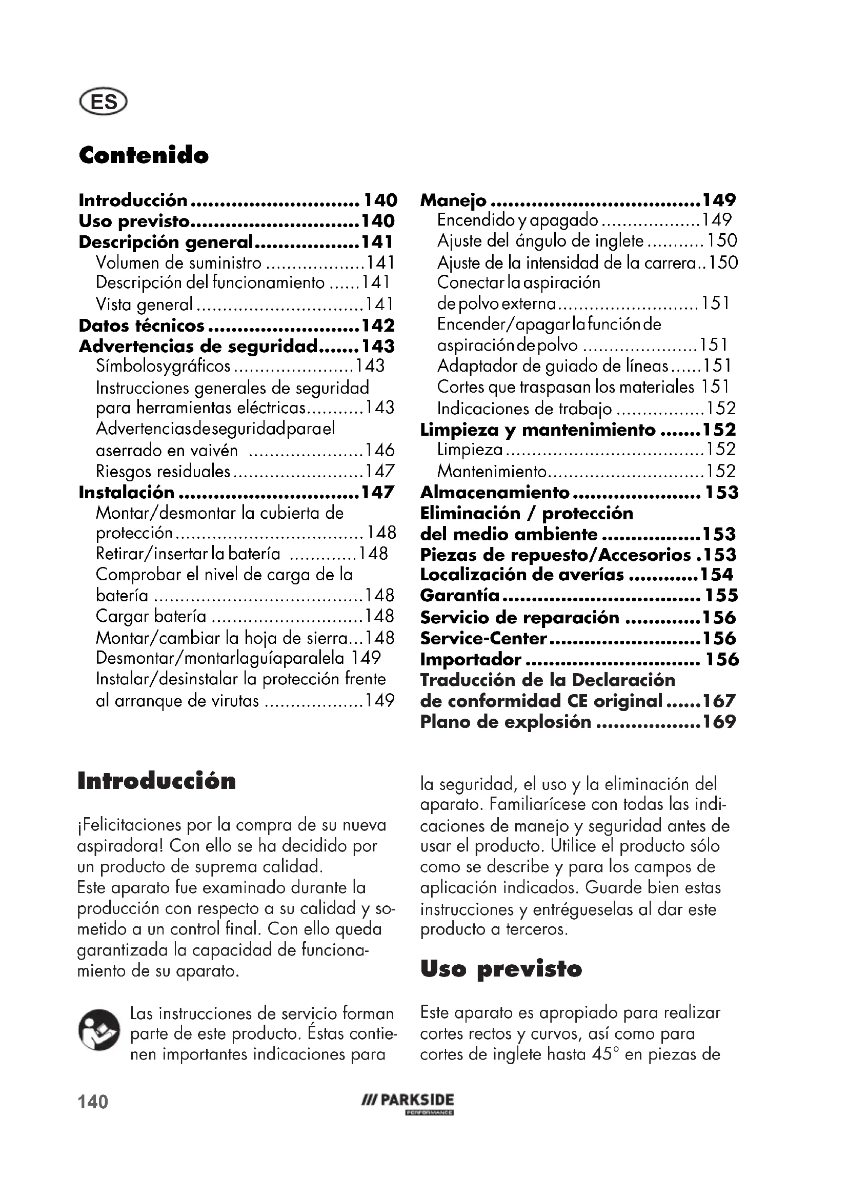 - Importador la seguridad, el uso y la eliminación del aparato. Familiarícese con todas las indi- caciones de manejo y seguridad antes de usar el producto. Utilice el producto sólo como se describe y para los campos de aplicación indicados. Guarde bien estas instrucciones y entrégueselas al dar este producto a terceros. Usoprevisto Este aparato es apropiado para realizar cortes rectos y curvos, así como para cortes de inglete hasta 45° en piezas deES p. 156
