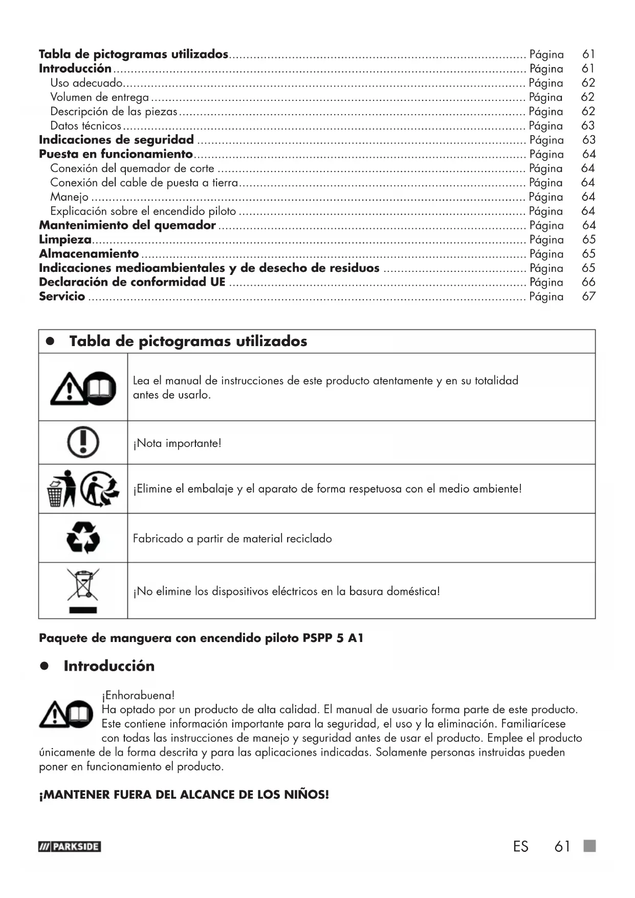 Tabla de pictogramas utilizados Lea el manual de instrucciones de este producto atentamente y en su totalidad antes de usarlo. ¡Nota importante! ¡Elimine el embalaje y el aparato de forma respetuosa con el medio ambiente! Fabricado a partir de material reciclado ¡No elimine los dispositivos eléctricos en la basura doméstica! Paquete de manguera con encendido piloto PSPP 5 A1 Introducción ¡Enhorabuena! Ha optado por un producto de alta calidad. El manual de usuario forma parte de este producto. Este contiene información importante para la seguridad, el uso y la eliminación. Familiarícese con todas las instrucciones de manejo y seguridad antes de usar el producto. Emplee el producto únicamente de la forma descrita y para las aplicaciones indicadas. Solamente personas instruidas pueden poner en funcionamiento el producto. ¡MANTENER FUERA DEL ALCANCE DE LOS NIÑOS! Tabla de pictogramas utilizados..................................................................................... Página 61 Introducción ...................................................................................................................... Página 61 Uso adecuado................................................................................................................... Página 62 Volumen de entrega ........................................................................................................... Página 62 Descripción de las piezas ................................................................................................... Página 62 Datos técnicos ................................................................................................................... Página 63 Indicaciones de seguridad .............................................................................................. Página 63 Puesta en funcionamiento ............................................................................................... Página 64 Conexión del quemador de corte ........................................................................................ Página 64 Conexión del cable de puesta a tierra .................................................................................. Página 64 Manejo ............................................................................................................................ Página 64 Explicación sobre el encendido piloto .................................................................................. Página 64 Mantenimiento del quemador ........................................................................................ Página 64 Limpieza............................................................................................................................ Página 65 Almacenamiento .............................................................................................................. Página 65 Indicaciones medioambientales y de desecho de residuos ......................................... Página 65 Declaración de conformidad UE ..................................................................................... Página 66 Servicio ............................................................................................................................. Página 67 389165_2104_Schlauchpaket mit Pilotzuendung PSPP 5 A1_content_LB8.indb 61389165_2104_Schlauchpaket mit Pilotzuendung PSPP 5 A1_content_LB8.indb 61 12.10.21 15:3212.10.21 15:3262