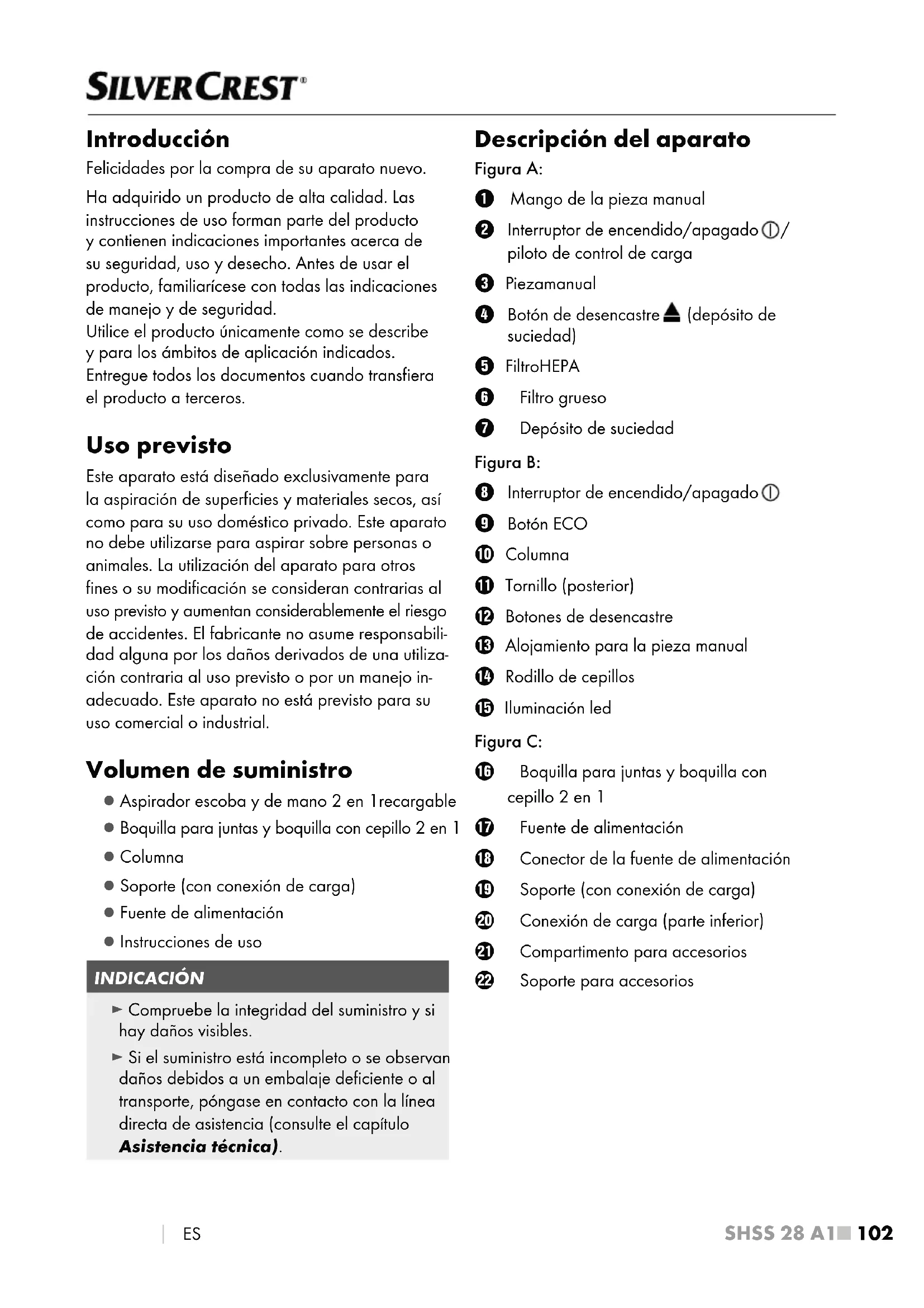 ES Introducción Felicidades por la compra de su aparato nuevo. Ha adquirido un producto de alta calidad. Las instrucciones de uso forman parte del producto y contienen indicaciones importantes acerca de su seguridad, uso y desecho. Antes de usar el producto, familiarícese con todas las indicaciones de manejo y de seguridad. Utilice el producto únicamente como se describe y para los ámbitos de aplicación indicados. Entregue todos los documentos cuando transfiera el producto a terceros. Uso previsto Este aparato está diseñado exclusivamente para la aspiración de superficies y materiales secos, así como para su uso doméstico privado. Este aparato no debe utilizarse para aspirar sobre personas o animales. La utilización del aparato para otros fines o su modificación se consideran contrarias al uso previsto y aumentan considerablemente el riesgo de accidentes. El fabricante no asume responsabili- dad alguna por los daños derivados de una utiliza- ción contraria al uso previsto o por un manejo in- adecuado. Este aparato no está previsto para su uso comercial o industrial. Volumen de suministro ▯ Aspirador escoba y de mano 2 en 1recargable ▯ Boquilla para juntas y boquilla con cepillo 2 en 1 ▯ Columna ▯ Soporte (con conexión de carga) ▯ Fuente de alimentación ▯ Instrucciones de uso INDICACIÓN ► Compruebe la integridad del suministro y si hay daños visibles. ► Si el suministro está incompleto o se observan daños debidos a un embalaje deficiente o al transporte, póngase en contacto con la línea directa de asistencia (consulte el capítulo Asistencia técnica). Descripción del aparato Figura A: 1 Mango de la pieza manual 2 Interruptor de encendido/apagado / piloto de control de carga 3 Pieza manual 4 Botón de desencastre (depósito de suciedad) 5 Filtro HEPA 6 Filtro grueso 7 Depósito de suciedad Figura B: 8 Interruptor de encendido/apagado