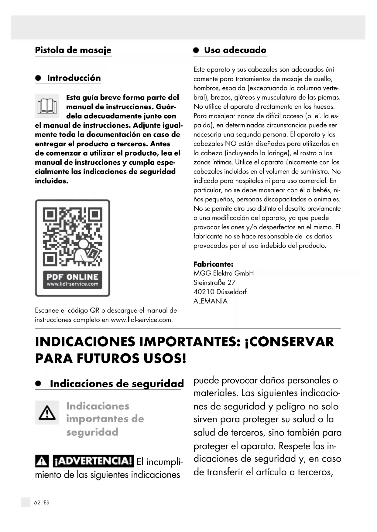 do polohy „OFF“. Prístroj je úplne vypnutý. Poznámka: Ak sa prístroj počas používania zastaví, môže to byť výsledkom nadmerného tlaku. Preto sa uistite, že počas používania na prístroj nevyvíjate príliš veľký tlak.6061 ES Introducción .............................................................................................................................. Página 62 Uso adecuado ......................................................................................................................... Página 62 Indicaciones de seguridad ............................................................................................ Página 62 Indicaciones importantes de seguridad ......................................................................................... Página 62 Indicaciones de seguridad sobre baterías .................................................................................... Página 65 Antes de la puesta en funcionamiento ............................................................... Página 66 Cargar el aparato ........................................................................................................................... Página 66 Puesta en funcionamiento ............................................................................................ Página 66 Información general de uso ........................................................................................................... Página 66 Seleccionar / cambiar el cabezal .................................................................................................. Página 66 Ejemplos de uso .............................................................................................................................. Página 67 Encender / apagar el aparato / Seleccionar nivel de intensidad ................................................ Página 6762 ES Indicaciones de seguridad Indicaciones importantes de seguridad El incumpli- miento de las siguientes indicaciones puede provocar daños personales o materiales. Las siguientes indicacio- nes de seguridad y peligro no solo sirven para proteger su salud o la salud de terceros, sino también para proteger el aparato. Respete las in- dicaciones de seguridad y, en caso de transferir el artículo a terceros, Pistola de masaje Introducción Esta guía breve forma parte del manual de instrucciones. Guár- dela adecuadamente junto con el manual de instrucciones. Adjunte igual- mente toda la documentación en caso de entregar el producto a terceros. Antes de comenzar a utilizar el producto, lea el manual de instrucciones y cumpla espe- cialmente las indicaciones de seguridad incluidas. Escanee el código QR o descargue el manual de instrucciones completo en www.lidl-service.com. Uso adecuado Este aparato y sus cabezales son adecuados úni- camente para tratamientos de masaje de cuello, hombros, espalda (exceptuando la columna verte- bral), brazos, glúteos y musculatura de las piernas. No utilice el aparato directamente en los huesos. Para masajear zonas de difícil acceso (p. ej. la es- palda), en determinadas circunstancias puede ser necesaria una segunda persona. El aparato y los cabezales NO están diseñados para utilizarlos en la cabeza (incluyendo la laringe), el rostro o las zonas íntimas. Utilice el aparato únicamente con los cabezales incluidos en el volumen de suministro. No indicado para hospitales ni para uso comercial. En particular, no se debe masajear con él a bebés, ni- ños pequeños, personas discapacitadas o animales. No se permite otro uso distinto al descrito previamente o una modificación del aparato, ya que puede provocar lesiones y/o desperfectos en el mismo. El fabricante no se hace responsable de los daños provocados por el uso indebido del producto. Fabricante: MGG Elektro GmbH Steinstraße 27 40210 Düsseldorf ALEMANIA