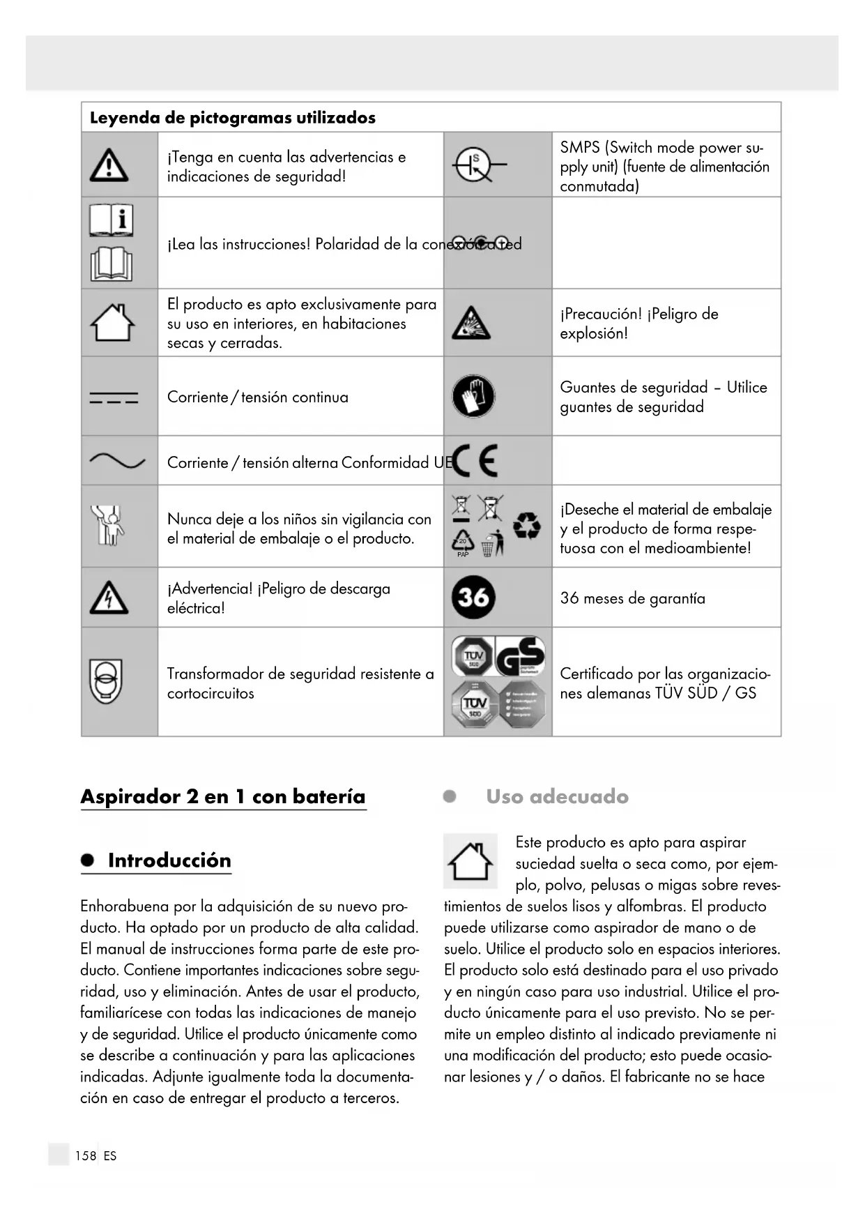 PAP ¡Deseche el material de embalaje y el producto de forma respe- tuosa con el medioambiente! ¡Advertencia! ¡Peligro de descarga eléctrica! 36 meses de garantía Transformador de seguridad resistente a cortocircuitos Certificado por las organizacio- nes alemanas TÜV SÜD / GS Aspirador 2 en 1 con batería Introducción Enhorabuena por la adquisición de su nuevo pro- ducto. Ha optado por un producto de alta calidad. El manual de instrucciones forma parte de este pro- ducto. Contiene importantes indicaciones sobre segu- ridad, uso y eliminación. Antes de usar el producto, familiarícese con todas las indicaciones de manejo y de seguridad. Utilice el producto únicamente como se describe a continuación y para las aplicaciones indicadas. Adjunte igualmente toda la documenta- ción en caso de entregar el producto a terceros. Uso adecuado Este producto es apto para aspirar suciedad suelta o seca como, por ejem- plo, polvo, pelusas o migas sobre reves- timientos de suelos lisos y alfombras. El producto puede utilizarse como aspirador de mano o de suelo. Utilice el producto solo en espacios interiores. El producto solo está destinado para el uso privado y en ningún caso para uso industrial. Utilice el pro- ducto únicamente para el uso previsto. No se per- mite un empleo distinto al indicado previamente ni una modificación del producto; esto puede ocasio- nar lesiones y / o daños. El fabricante no se hace159 ES responsable de los daños provocados por el uso indebido del producto. Descripción de los componentes