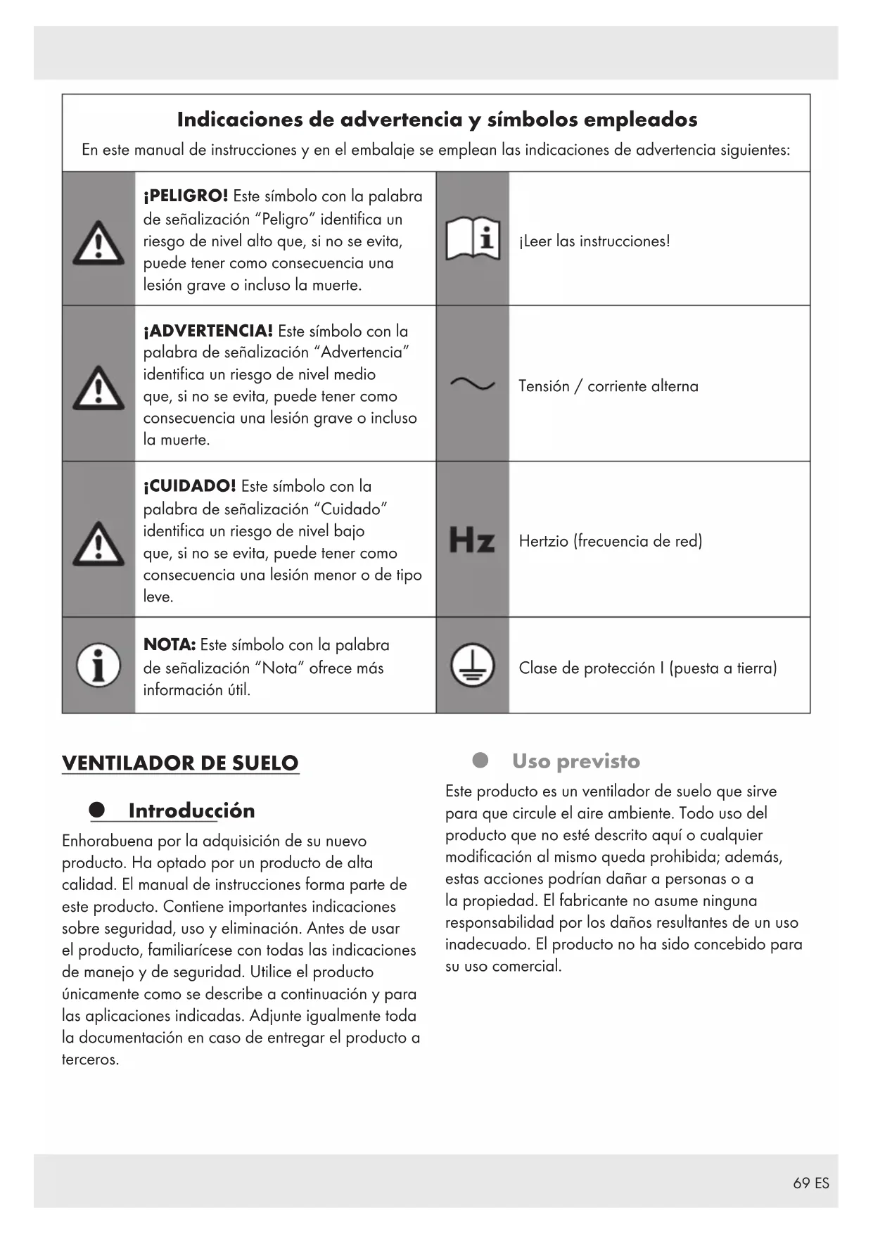 Introducción Enhorabuena por la adquisición de su nuevo producto. Ha optado por un producto de alta calidad. El manual de instrucciones forma parte de este producto. Contiene importantes indicaciones sobre seguridad, uso y eliminación. Antes de usar el producto, familiarícese con todas las indicaciones de manejo y de seguridad. Utilice el producto únicamente como se describe a continuación y para las aplicaciones indicadas. Adjunte igualmente toda la documentación en caso de entregar el producto a terceros. Uso previsto Este producto es un ventilador de suelo que sirve para que circule el aire ambiente. Todo uso del producto que no esté descrito aquí o cualquier modificación al mismo queda prohibida; además, estas acciones podrían dañar a personas o a la propiedad. El fabricante no asume ninguna responsabilidad por los daños resultantes de un uso inadecuado. El producto no ha sido concebido para su uso comercial.70 ES Volumen de suministro Después de desembalar el producto, compruebe si la entrega está completa y todas las piezas están en perfecto estado. Antes del uso, elimine la totalidad de los materiales de embalaje. 1 Ventilador de suelo 1 Manual de instrucciones Descripción de las piezas