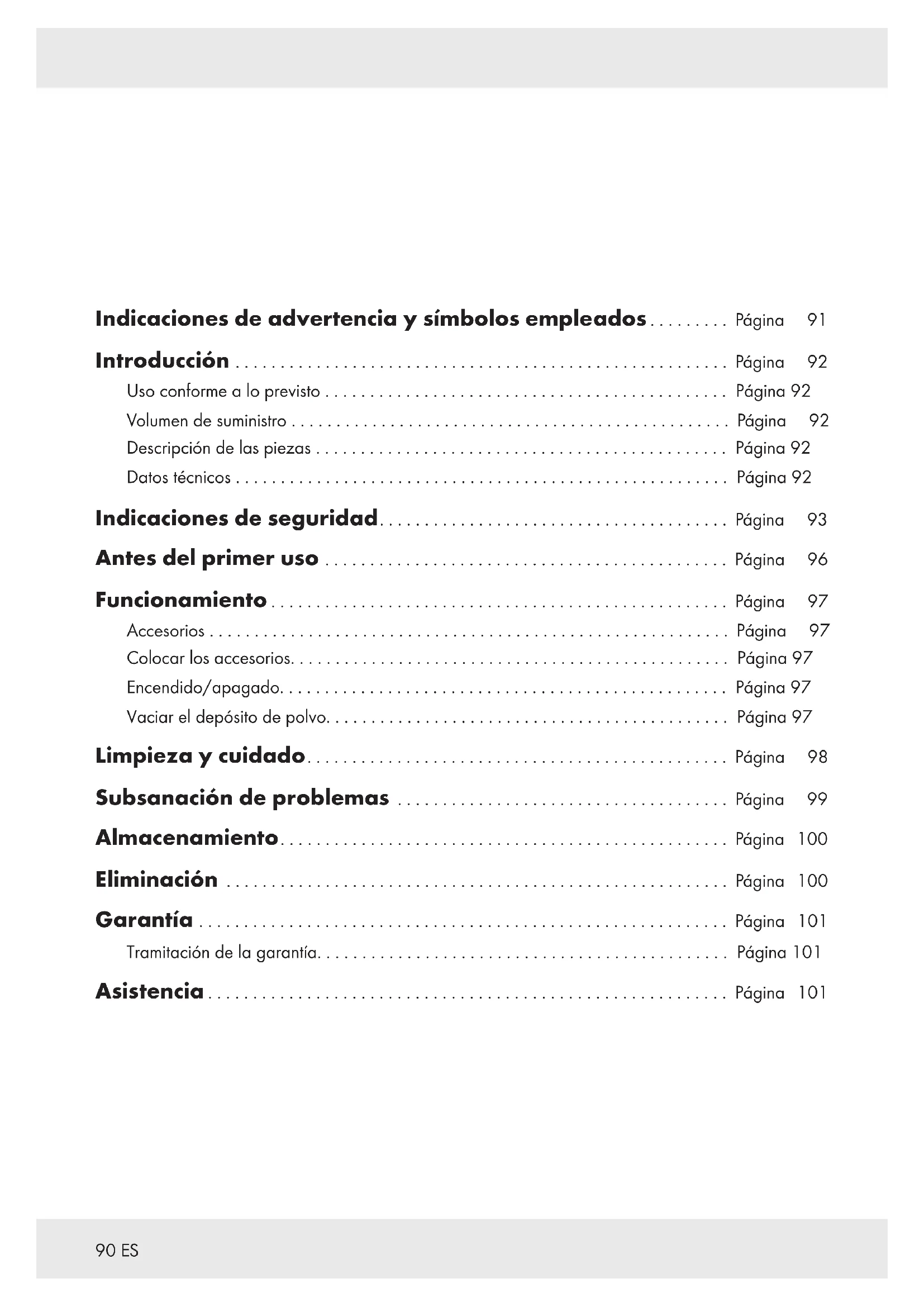 DOCUMENTACIÓN! ¡Queda anulada su garantía en el caso de daños por la no contemplación de este manual de instrucciones! ¡No se asumirá ninguna responsabilidad por daños indirectos! ¡No se asumirá ninguna responsabilidad en el caso de daños materiales o a personas por un uso inadecuado o por la no contemplación de las indicaciones de seguridad! Niños y personas con limitaciones m¡ADVERTENCIA! ¡PELIGRO DE MUERTE O ACCIDENTES EN BEBÉS Y NIÑOS! Nunca deje a los niños solos con el material de embalaje. Existe peligro de asfixia con el material de embalaje. Los niños a menudo subestiman los peligros. Este producto puede ser utilizado por niños mayores de 8años, así como por personas con capacidades físicas, sensoriales o mentales reducidas o que cuenten con poca experiencia y falta de conocimientos, siempre y cuando se les haya enseñado cómo utilizar el producto de forma segura y hayan comprendido los peligros que pueden resultar de un mal uso del mismo. No permita que los niños jueguen con el producto. La limpieza y mantenimiento por parte del usuario no deben ser llevados a cabo por niños, a menos que estos sean mayores de 8años y estén bajo supervisión.94 ES Uso conforme a lo previsto m¡ADVERTENCIA! ¡Riesgo de lesión! Un uso no conforme a lo previsto puede provocar lesiones. Utilice solo el producto conforme a este manual de instrucciones. Nunca intente modificar el producto en modo alguno. Seguridad eléctrica m¡PELIGRO! ¡Riesgo de descarga eléctrica! Nunca intente reparar el producto usted mismo. En caso de fallo de funcionamiento, deje que solo el personal cualificado lleve a cabo las reparaciones. m¡ADVERTENCIA! ¡Riesgo de descarga eléctrica! No sumerja las piezas eléctricas del producto en agua u otros líquidos. Nunca ponga el producto debajo del agua corriente. m¡ADVERTENCIA! ¡Riesgo de descarga eléctrica! No utilice ningún producto dañado. Desconecte el producto de la red eléctrica y póngase en contacto con su distribuidor si estuviera dañado. m¡ADVERTENCIA! ¡Riesgo de descarga eléctrica! No maneje el producto con las manos húmedas o si se encuentra sobre suelo húmedo. m¡ADVERTENCIA! ¡Riesgo de lesión! Apague el producto y desconéctelo de la red eléctrica antes de realizar los trabajos de limpieza y siempre que no lo vaya a usar. No utilice el producto si se le ha caído. Antes de conectar el enchufe al suministro de corriente: Asegúrese de que la tensión nominal de la placa de características del producto coincida con la tensión nominal de su suministro de corriente.95ES Compruebe regularmente la presencia de daños en el enchufe y el cable de conexión. Si el cable de conexión está dañado, deje que el fabricante, su representante de servicio al cliente o una persona con una cualificación similar lo reemplace para evitar riesgos. Proteja el cable de conexión de posibles daños. No deje que cuelgue sobre bordes afilados ni tampoco lo aplaste o doble. Mantenga alejado el cable de conexión de superficies calientes y llamas abiertas. Funcionamiento Desconecte el enchufe de la toma de corriente –si se produce un fallo de funcionamiento, –antes de colocar/cambiar los accesorios, –antes de limpiar el producto, –si no va a utilizar el producto durante un periodo largo de tiempo, –durante una tormenta y –después de cada uso. Para desconectar el producto de la toma de corriente, tire del enchufe y nunca lo haga del cable de conexión. Las piezas defectuosas deben sustituirse siempre por piezas de repuesto originales. No cubra las ranuras de ventilación durante el funcionamiento. Existe riesgo de sobrecalentamiento y daños en el producto. Nunca aspire agua u otros líquidos con el producto ni tampoco sustancias inflamables u objetos calientes/ardiendo. El producto dispone de un fusible térmico que interrumpe el suministro de corriente de forma automática en caso de sobrecalentamiento. Si este dispositivo de seguridad apaga el producto, desconecte el enchufe de la toma de corriente y deje enfriar el producto. Una vez se haya enfriado el producto, ya puede volver a insertar el enchufe en la toma de corriente y utilizar el producto con normalidad.96 ES Limpieza y almacenamiento m¡ADVERTENCIA! ¡Riesgo de lesión! Desconecte el producto de la red eléctrica antes de limpiarlo o si no está en uso. Proteja el producto, cable de conexión y enchufe del polvo, radiación solar directa, goteo y salpicaduras. Guarde el producto en un lugar seco, refrigerado, protegido contra la humedad y fuera del alcance de los niños. Proteja el producto contra el calor. No coloque el producto cerca de llamas abiertas o fuentes de calor como hornos o aparatos de calefacción. Antes del primer uso Retire todo el material de embalaje y extienda todos los componentes por separado delante de usted. Después de desembalar el producto, compruebe que no presenta daños visibles.97ES Funcionamiento Accesorios Pieza Ámbito de aplicación