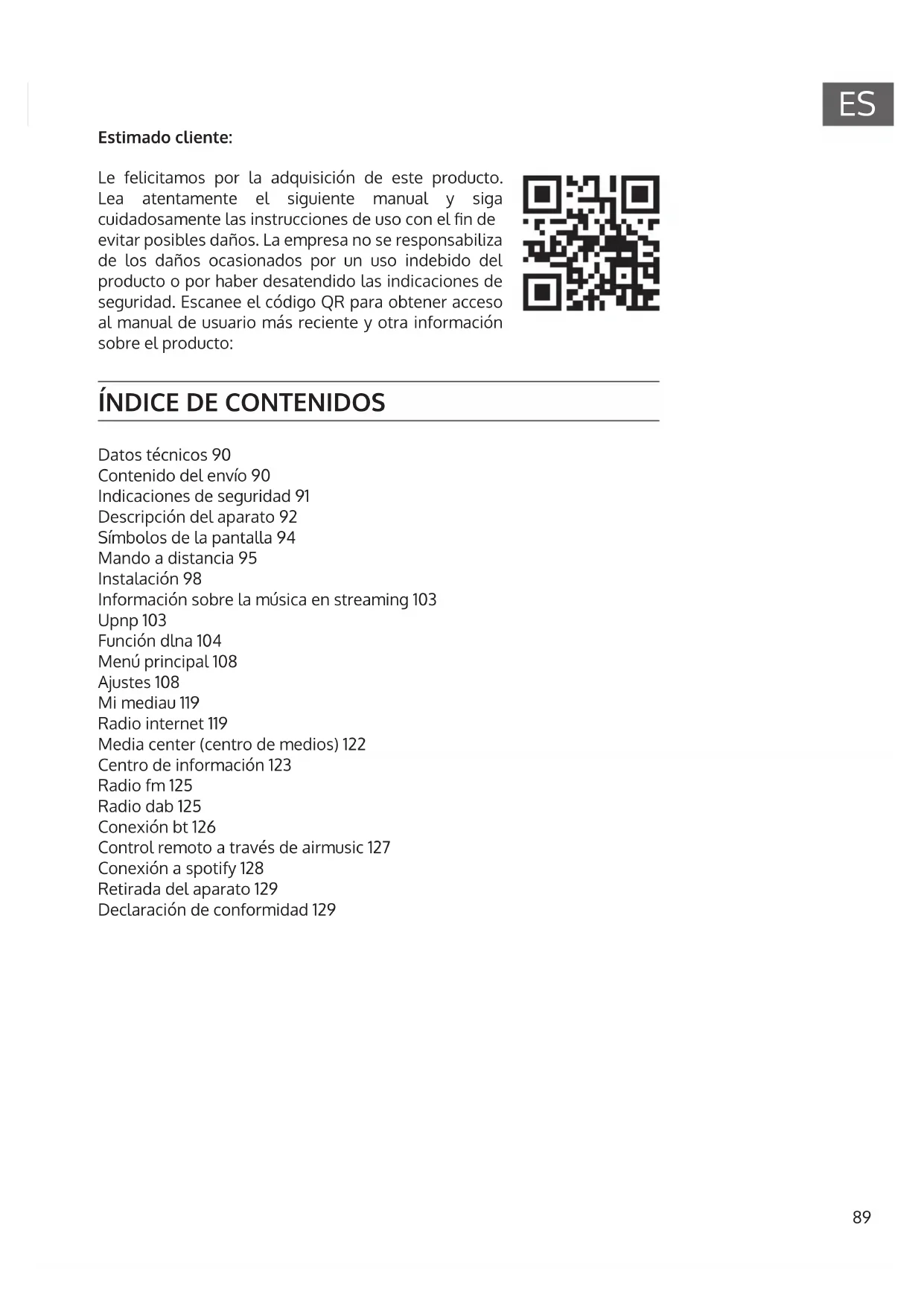 Datos técnicos 90 Contenido del envío 90 Indicaciones de seguridad 91 Descripción del aparato 92 Símbolos de la pantalla 94 Mando a distancia 95 Instalación 98 Información sobre la música en streaming 103 Upnp 103 Función dlna 104 Menú principal 108 Ajustes 108 Mi mediau 119 Radio internet 119 Media center (centro de medios) 122 Centro de información 123 Radio fm 125 Radio dab 125 Conexión bt 126 Control remoto a través de airmusic 127 Conexión a spotify 128 Retirada del aparato 129 Declaración de conformidad 12990
