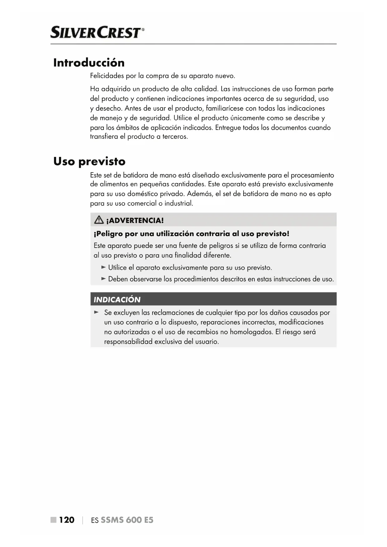 Introducción Felicidades por la compra de su aparato nuevo. Ha adquirido un producto de alta calidad. Las instrucciones de uso forman parte del producto y contienen indicaciones importantes acerca de su seguridad, uso y desecho. Antes de usar el producto, familiarícese con todas las indicaciones de manejo y de seguridad. Utilice el producto únicamente como se describe y para los ámbitos de aplicación indicados. Entregue todos los documentos cuando transfiera el producto a terceros. Uso previsto Este set de batidora de mano está diseñado exclusivamente para el procesamiento de alimentos en pequeñas cantidades. Este aparato está previsto exclusivamente para su uso doméstico privado. Además, el set de batidora de mano no es apto para su uso comercial o industrial. ¡ADVERTENCIA! ¡Peligro por una utilización contraria al uso previsto! Este aparato puede ser una fuente de peligros si se utiliza de forma contraria al uso previsto o para una finalidad diferente. ► Utilice el aparato exclusivamente para su uso previsto. ► Deben observarse los procedimientos descritos en estas instrucciones de uso. INDICACIÓN