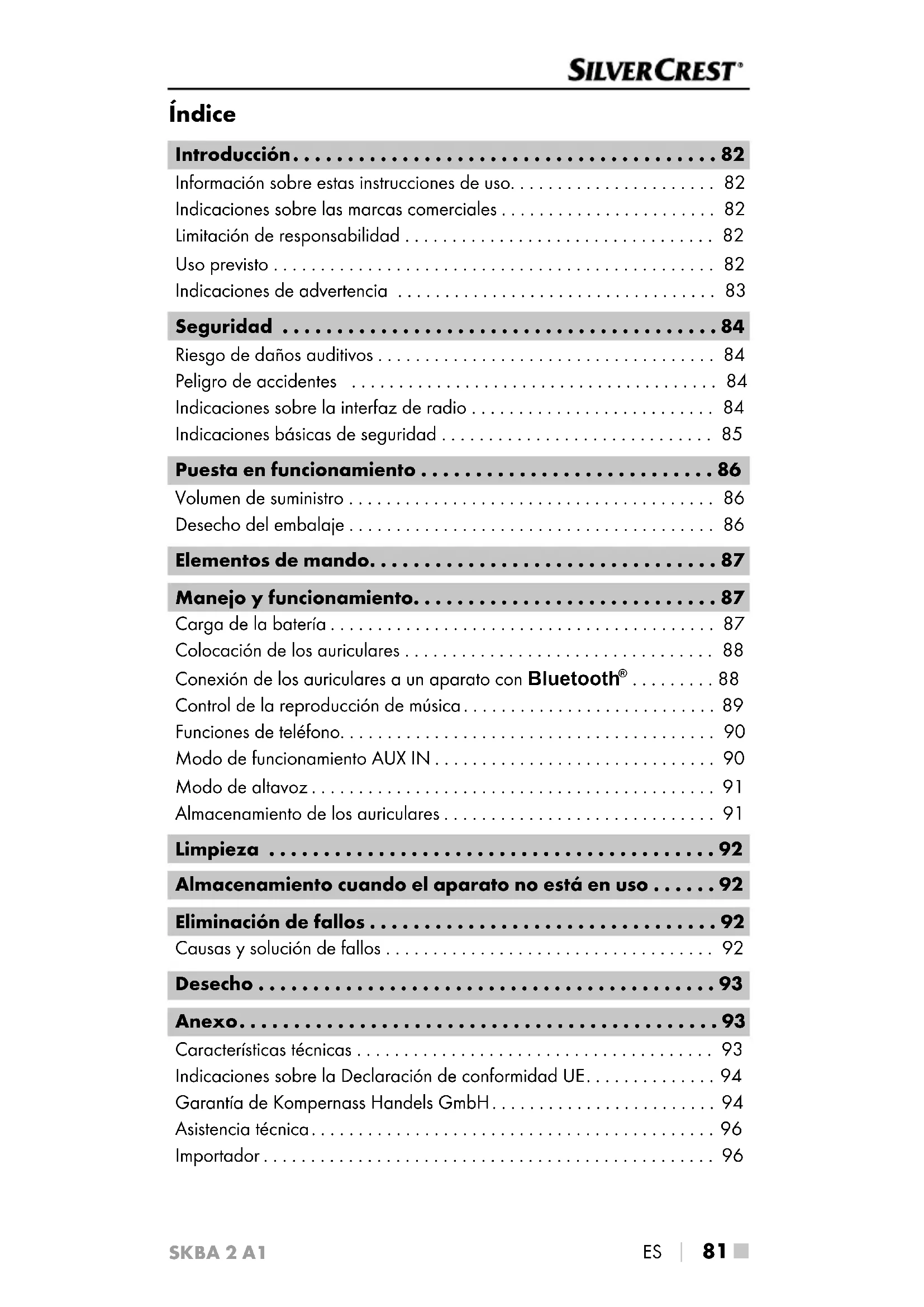 ES Altavoces exterior Potencia de salida 2 x aprox. 1 W RMS a 10 % THD Impedancia 4 Ω ± 1 Ω Rango de transmisión 180Hz – 20kHz Tiempo de funcionamiento modo altavoz Aprox. 5h (reproducción de música a volumen medio) Indicaciones sobre la Declaración de conformidad UE Este aparato cumple los requisitos básicos y las demás normas relevantes de la Directiva sobre la comercialización de equipos radioeléctricos 2014/53/EU y de la Directiva sobre restriccio- nes a la utilización de determinadas sustancias peligrosas en aparatos eléctricos y electrónicos 2011/65/EU. Podrá descargar la Declaración de conformidad UE completa en www.kompernass.com/support/288242_DOC.pdf. Garantía de Kompernass Handels GmbH Estimado cliente: Este aparato cuenta con una garantía de 3 años a partir de la fecha de compra. Si se detectan defectos en el producto, puede ejercer sus derechos legales frente al vendedor. Estos derechos legales no se ven limitados por la garantía descrita a continuación. Condiciones de la garantía El plazo de la garantía comienza con la fecha de compra. Guarde bien el comprobante de caja original, ya que lo necesitará como justificante de compra. Si dentro de un periodo de tres años a partir de la fecha de compra de este producto se detecta un defecto en su material o un error de fabricación, asu- miremos la reparación o sustitución gratuita del producto a nuestra elección. La prestación de la garantía requiere la presentación del aparato defectuoso y del comprobante de caja, así como una breve descripción por escrito del defecto detectado y de las circunstancias en las que se haya producido dicho defecto, dentro del plazo de tres años. Si el defecto está cubierto por nuestra garantía, le devolveremos el producto reparado o le suministraremos uno nuevo. La reparación o sustitución del producto no supone el inicio de un nuevo periodo de garantía. Duración de la garantía y reclamaciones legales por vicios La duración de la garantía no se prolonga por hacer uso de ella. Este prin- cipio también se aplica a las piezas sustituidas y reparadas. Si después de la compra del aparato, se detecta la existencia de daños o de defectos al desembalarlo, deben notificarse de inmediato. Cualquier reparación que se realice una vez finalizado el plazo de garantía estará sujeta a costes.SKBA 2 A1 ES