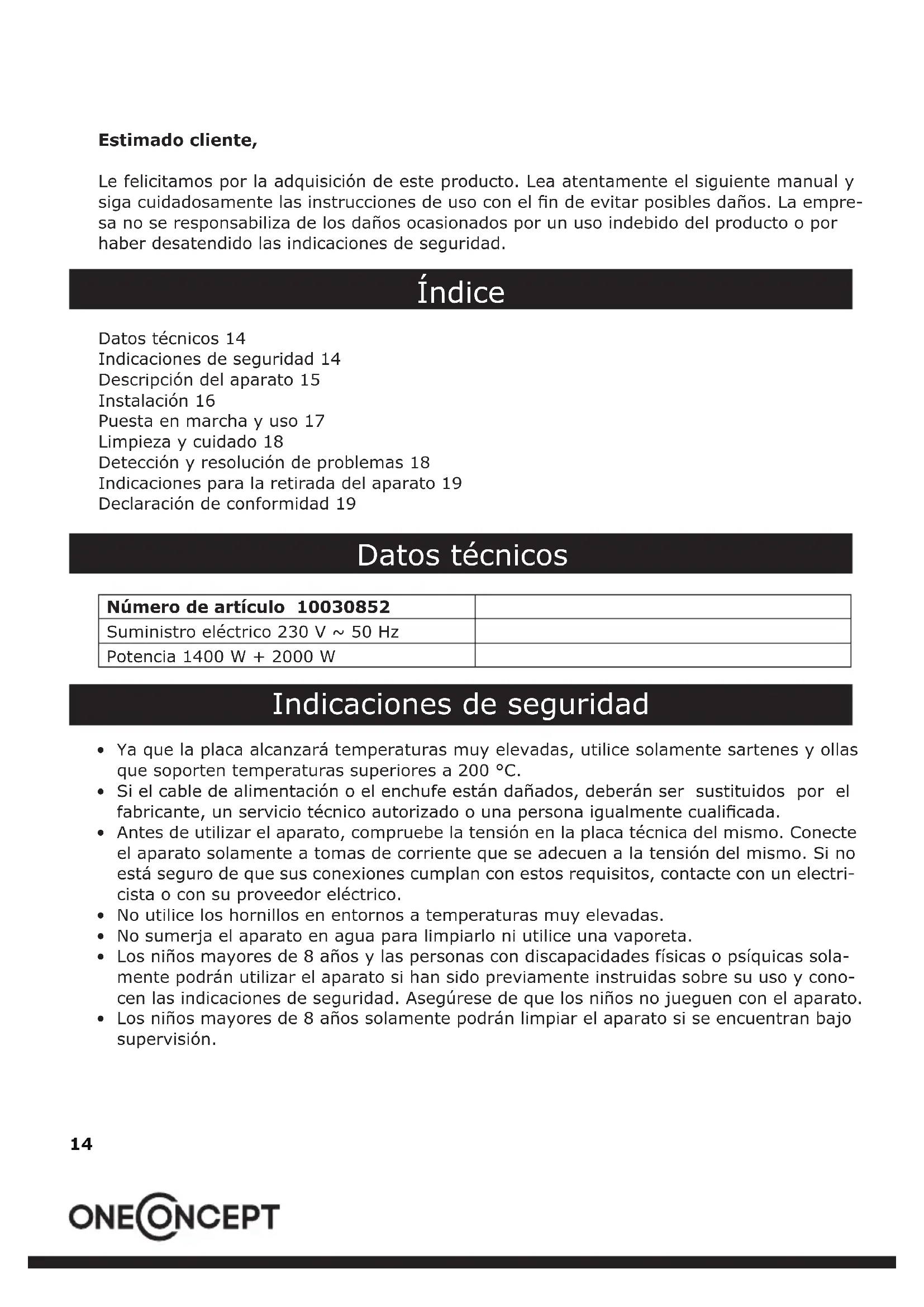 - No limpie la supercie con productos abrasivos ni disolventes ni utilice esponjas abrasivas para evitar daños en la supercie del aparato. Detección y resolución de problemas El indicador luminoso no se enciende al encender el apa- rato. La clema de conexión está suelta. El fusible se ha extraído o está averiado. No hay electricidad. Se escucha un zumbido y la luz ON/OFF parpadea pero el aparato no calienta. Compruebe si ha colocado una olla sobre la supercie de cocción. Compruebe si la olla se encuentra en el centro de la su- percie de la cocción. El aparato deja de calentar repentinamente durante su funcionamiento. La entrada o salida de aire están bloqueadas. La protección para el sobrecalentamiento se ha activado. La temperatura ambiente es demasiado alta. El temporizador ha nalizado o el aparato ha estado fun- cionando durante demasiado tiempo. El aparato no responde. Compruebe que ha conectado el enchufe. El display LED muestra el có- digo de error [E0] o un código similar junto con una alarma. Compruebe que la tensión de corriente no sea demasiado alta o baja. Desconecte el enchufe y encienda de nuevo el aparato transcurridos unos minutos. La temperatura ambiente es demasiado alta. No intente reparar el aparato usted mismo. Contacte con un servicio técnico o con el servi- cio de atención al cliente si es necesaria una reparación.19 Indicaciones para la retirada del aparato Si el aparato lleva adherida la ilustración de la izquierda (el contene- dor de basura tachado) entonces rige la normativa europea, directiva 2012/19/UE. Este producto no debe arrojarse a un contenedor de ba- sura común. Infórmese sobre las leyes territoriales que regulan la re- cogida separada de aparatos eléctricos y electrónicos. Respete las leyes territoriales y no arroje aparatos viejos al cubo de la basura doméstica. Una retirada de aparatos conforme a las leyes contribuye a proteger el medio ambiente y a las personas a su alrededor frente a posibles con- secuencias perjudiciales para la salud. El reciclaje ayuda a reducir el consumo de materias primas. Declaración de conformidad Fabricante: Chal-Tec GmbH, Wallstraße 16, 10179 Berlín (Alemania). Este producto cumple con las siguientes directivas europeas: 2014/30/UE (EMC) 2014/35/UE (baja tensión) 2011/65/UE (refundición RoHS)20 Chère cliente, cher client, Toutes nos félicitations pour l’acquisition de ce nouvel appareil. Veuillez lire attentivement et respecter les instructions de ce mode d’emploi an d’éviter d’éventuels dommages. Nous ne saurions être tenus pour responsables des dommages dus au non-respect des consignes et à la mauvaise utilisation de l’appareil. Sommaire Fiche technique 20 Consignes de sécurité 20 Aperçu de l’appareil 21 Installation 22 Mise en marche et utilisation 23 Nettoyage et entretien 24 Identication et résolution des problèmes 24 Information sur le recyclage 25 Déclaration de conformité 25 Fiche technique Numéro d’article 10030852 Alimentation électrique 230 V ~ 50 Hz Puissance 1400 W + 2000 W Consignes de sécurité