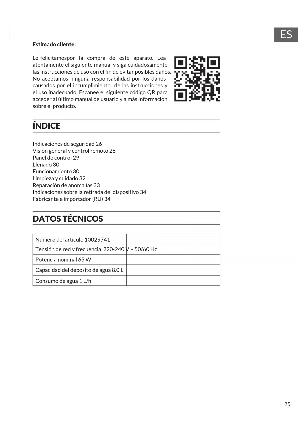 Estimado cliente: Le felicitamospor la compra de este aparato. Lea atentamente el siguiente manual y siga cuidadosamente las instrucciones de uso con el n de evitar posibles daños. No aceptamos ninguna responsabilidad por los daños causados por el incumplimiento de las instrucciones y el uso inadecuado. Escanee el siguiente código QR para acceder al último manual de usuario y a más información sobre el producto. ÍNDICE Indicaciones de seguridad 26 Visión general y control remoto 28 Panel de control 29 Llenado 30 Funcionamiento 30 Limpieza y cuidado 32 Reparación de anomalías 33 Indicaciones sobre la retirada del dispositivo 34 Fabricante e importador (RU) 34