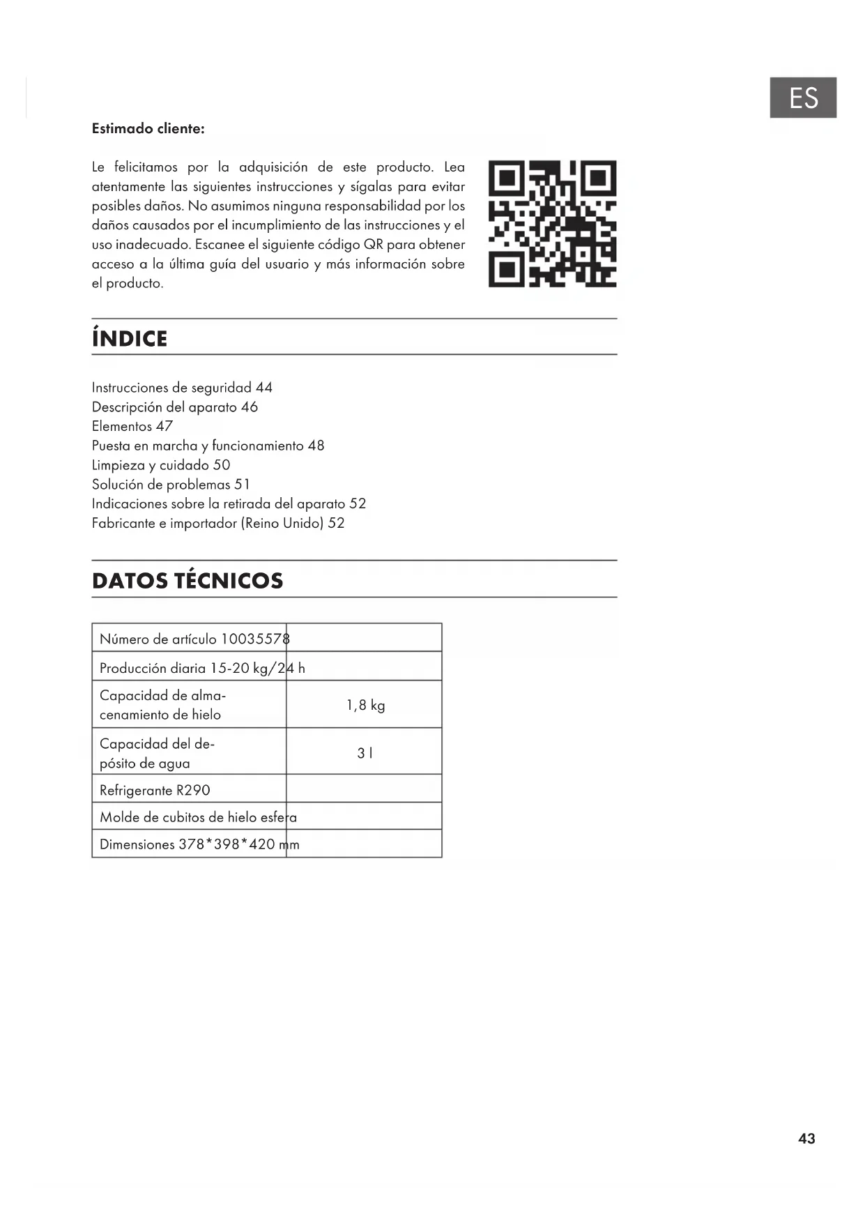 Refrigerante R290 Molde de cubitos de hielo esfera Dimensiones 378*398*420mm Instrucciones de seguridad44 Descripción del aparato46 Elementos47 Puesta en marcha y funcionamiento48 Limpieza y cuidado50 Solución de problemas51 Indicaciones sobre la retirada del aparato52 Fabricante e importador (Reino Unido)5244