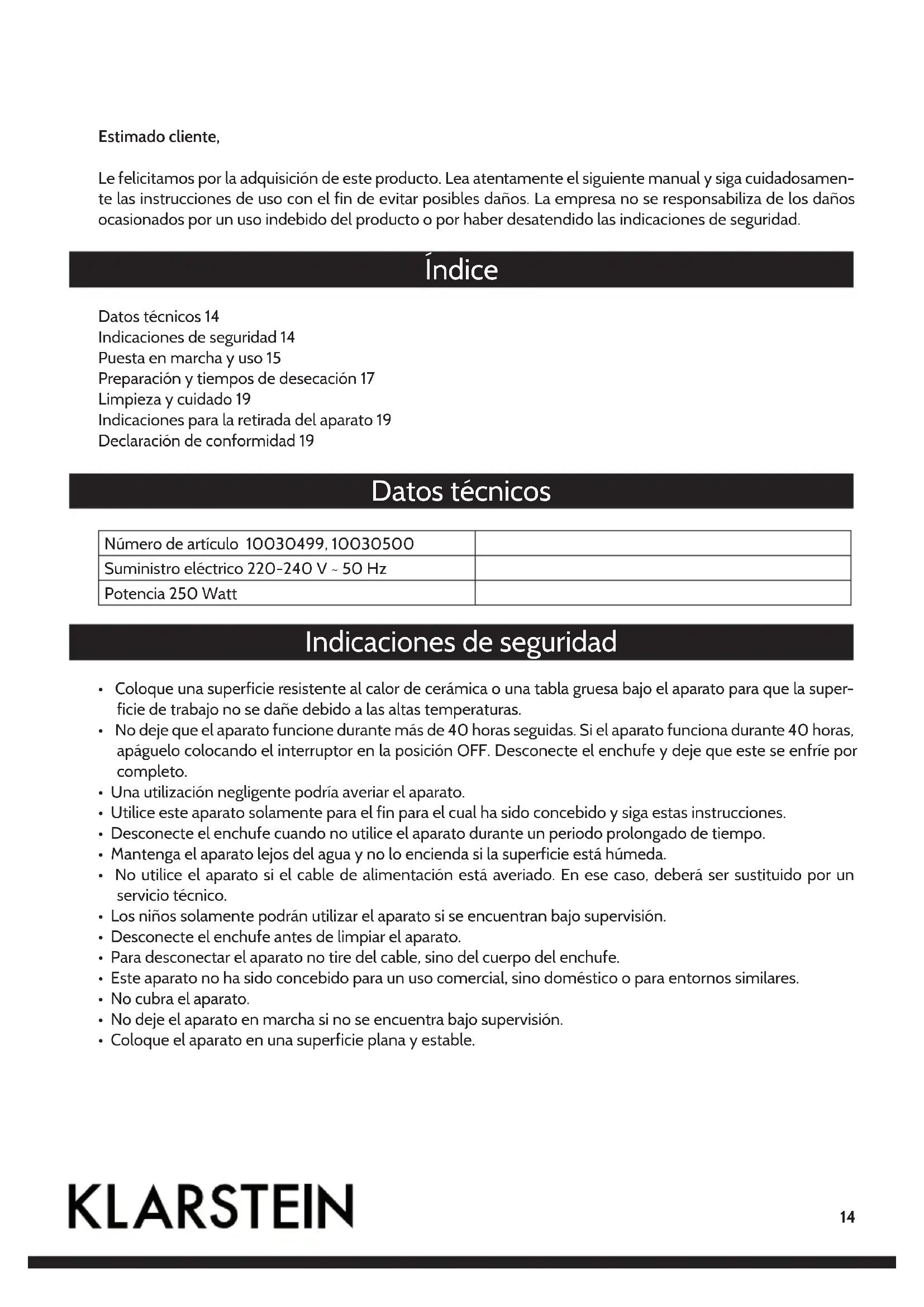- No utilice productos ni esponjas abrasivos para evitar dañar la superficie del aparato. Indicaciones para la retirada del aparato Si el aparato lleva adherida la ilustración de la izquierda (el contenedor de basura tachado) entonces rige la normativa europea, directiva 2002/96/CE. Este producto no debe arro- jarse a un contenedor de basura común. Infórmese sobre las leyes territoriales que regulan la recogida separada de aparatos eléctricos y electrónicos. Respete las leyes territoriales y no arroje aparatos viejos al cubo de la basura doméstica. Una retirada de aparatos con- forme a las leyes contribuye a proteger el medio ambiente y a las personas a su alrededor frente a posibles consecuencias perjudiciales para la salud. El reciclaje ayuda a reducir el consumo de materias primas. Declaración de conformidad Fabricante: Chal-Tec GmbH, Wallstraße 16, 10179 Berlín (Alemania). Este producto cumple con las siguientes directivas europeas: 2004/108/CE (EMC) 2011/65/UE (refundición RoHS) 2006/95/CE (baja tensión)20 Chère cliente, cher client, Toutes nos félicitations pour l’acquisition de ce nouvel appareil. Veuillez lire attentivement et respecter les instructions de ce mode d’emploi afin d’éviter d’éventuels dommages. Nous ne saurions être tenus pour res- ponsables des dommages dus au non-respect des consignes et à la mauvaise utilisation de l’appareil. Sommaire Fiche technique 20 Consignes de sécurité 20 Mise en marche et utilisation 21 Préparation et temps de séchage 23 Nettoyage et entretien 25 Information sur le recyclage 25 Déclaration de conformité 25 Fiche technique Numéro d’article 10030499, 10030500 Alimentation électrique 220-240 V ~ 50 Hz Puissance 250 Watts Consignes de sécurité