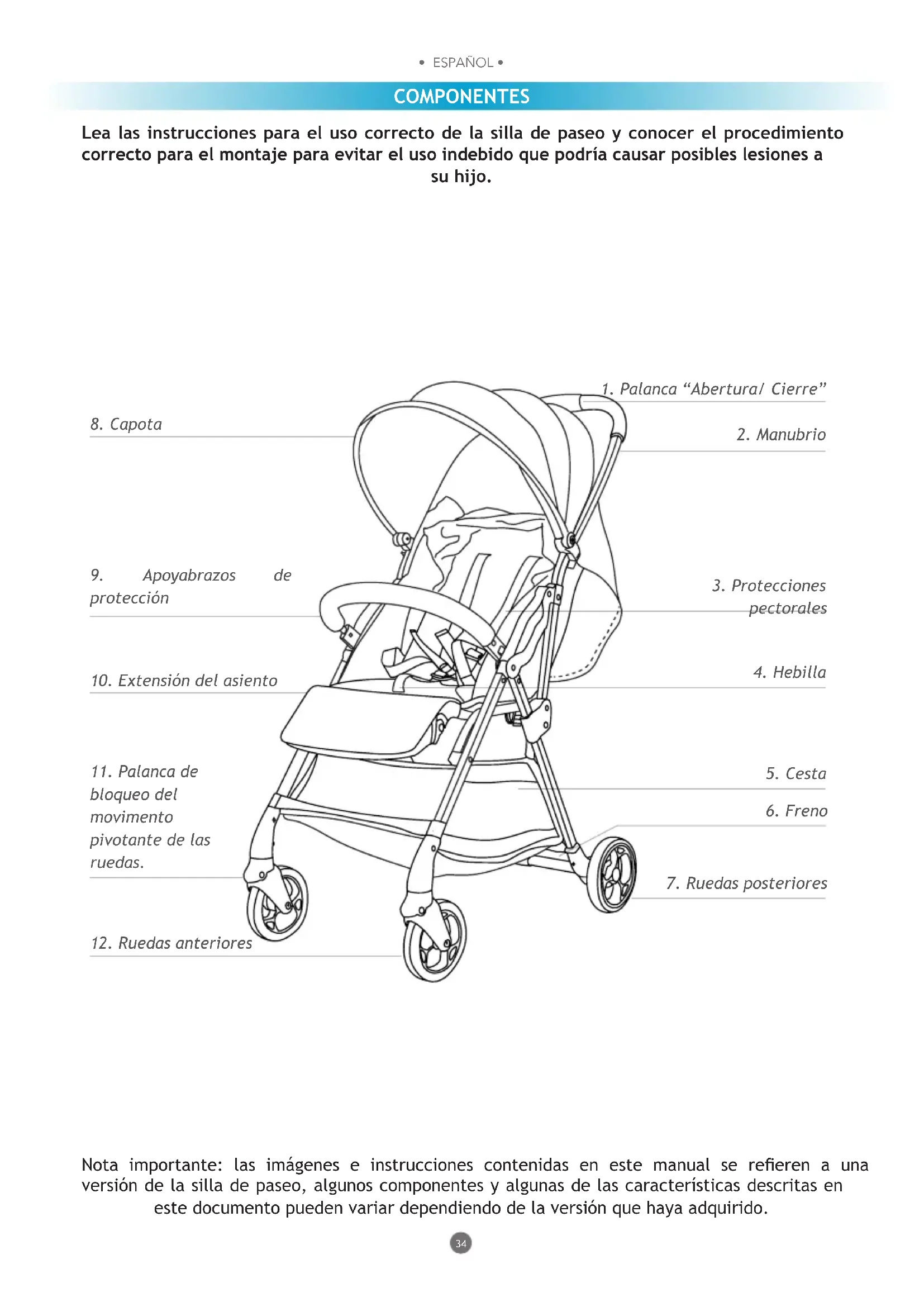 - ESPAÑOL • • ESPAÑOL • Lea las instrucciones para el uso correcto de la silla de paseo y conocer el procedimiento correcto para el montaje para evitar el uso indebido que podría causar posibles lesiones a su hijo. COMPONENTES Nota importante: las imágenes e instrucciones contenidas en este manual se reeren a una versión de la silla de paseo, algunos componentes y algunas de las características descritas en este documento pueden variar dependiendo de la versión que haya adquirido.