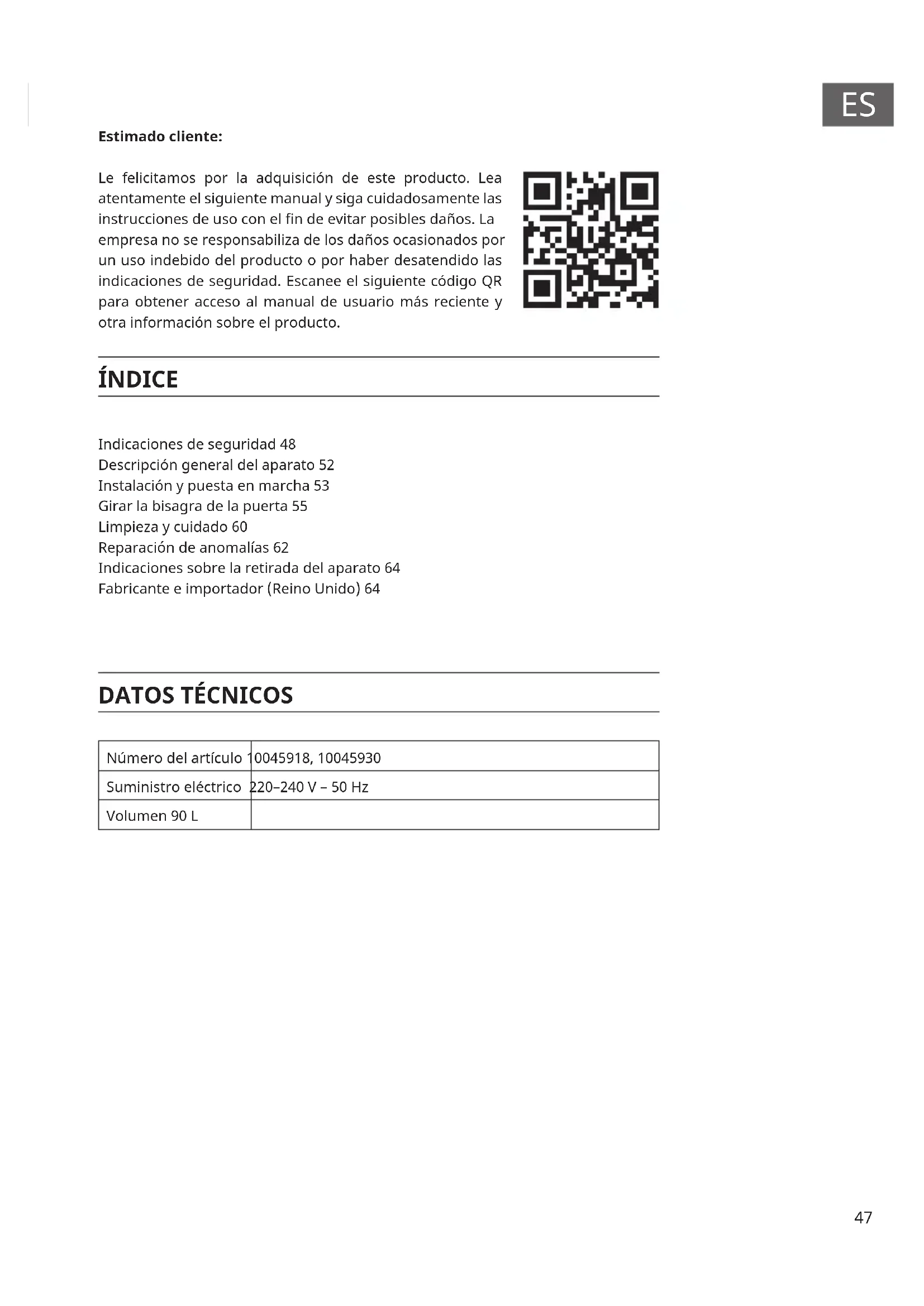 Número del artículo 10045918, 10045930 Suministro eléctrico 220–240 V – 50 Hz Volumen 90 L English 27Español Français Italiano Indicaciones de seguridad 48 Descripción general del aparato 52 Instalación y puesta en marcha 53 Girar la bisagra de la puerta 55 Limpieza y cuidado 60 Reparación de anomalías 62 Indicaciones sobre la retirada del aparato 64 Fabricante e importador (Reino Unido) 6448