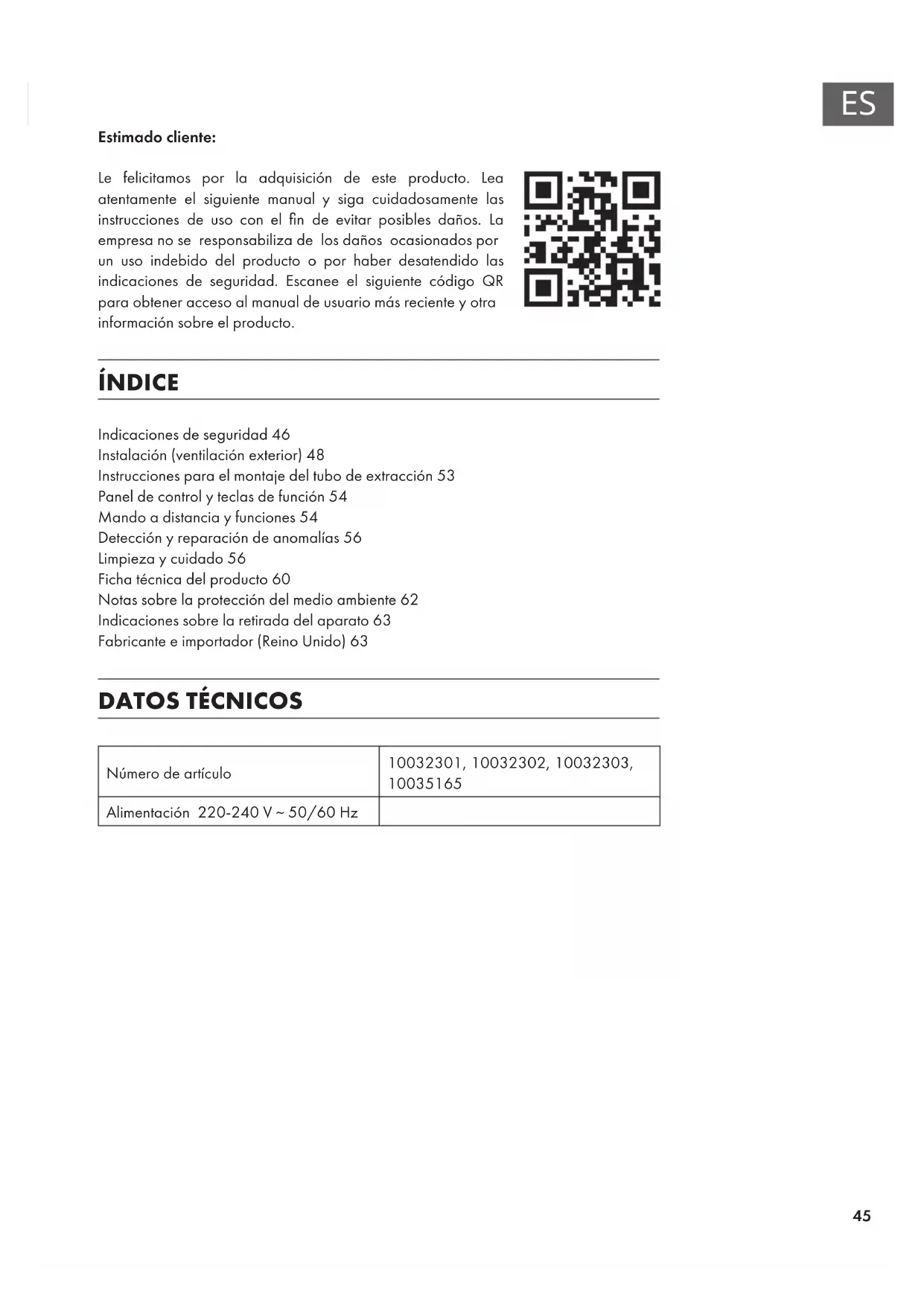 Estimado cliente: Le felicitamos por la adquisición de este producto. Lea atentamente el siguiente manual y siga cuidadosamente las instrucciones de uso con el n de evitar posibles daños. La empresa no se responsabiliza de los daños ocasionados por un uso indebido del producto o por haber desatendido las indicaciones de seguridad. Escanee el siguiente código QR para obtener acceso al manual de usuario más reciente y otra información sobre el producto. ÍNDICE Indicaciones de seguridad46 Instalación (ventilación exterior)48 Instrucciones para el montaje del tubo de extracción53 Panel de control y teclas de función54 Mando a distancia y funciones54 Detección y reparación de anomalías56 Limpieza y cuidado56 Ficha técnica del producto60 Notas sobre la protección del medio ambiente62 Indicaciones sobre la retirada del aparato63 Fabricante e importador (Reino Unido)63