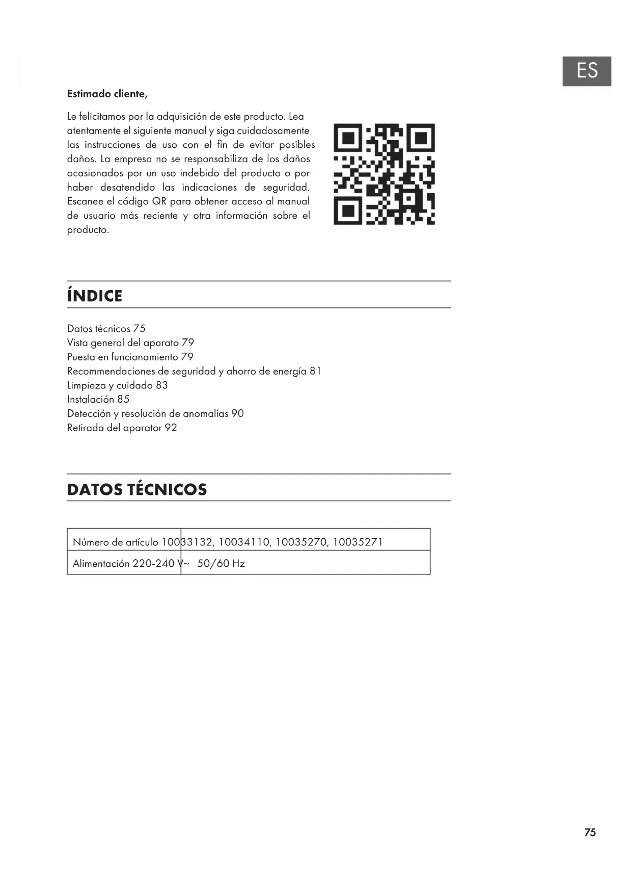 Número de artículo 10033132, 10034110, 10035270, 10035271 Alimentación 220-240 V~ 50/60 Hz Estimado cliente, Le felicitamos por la adquisición de este producto. Lea atentamente el siguiente manual y siga cuidadosamente las instrucciones de uso con el n de evitar posibles daños. La empresa no se responsabiliza de los daños ocasionados por un uso indebido del producto o por haber desatendido las indicaciones de seguridad. Escanee el código QR para obtener acceso al manual de usuario más reciente y otra información sobre el producto. ÍNDICE Datos técnicos 75 Vista general del aparato 79 Puesta en funcionamiento 79 Recommendaciones de seguridad y ahorro de energía 81 Limpieza y cuidado 83 Instalación 85 Detección y resolución de anomalías 90 Retirada del aparator 9276