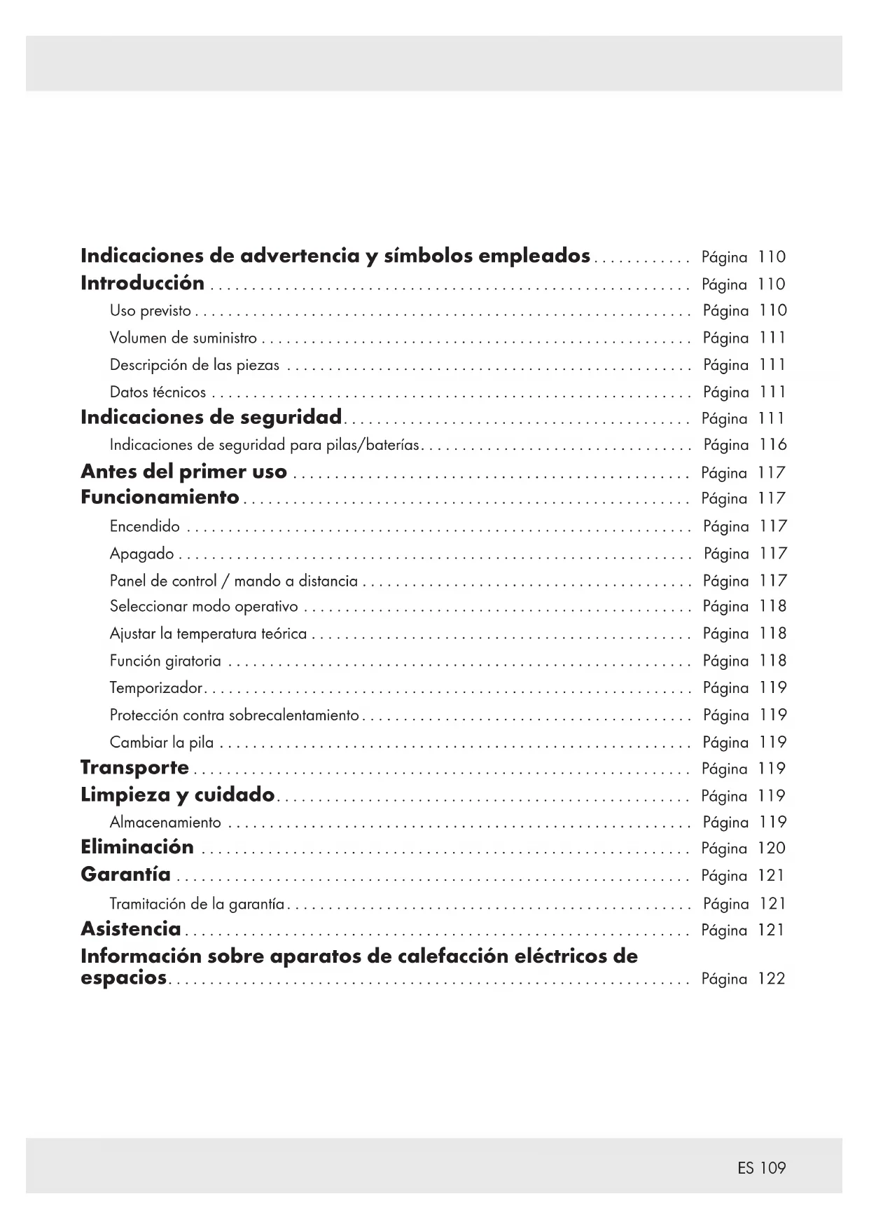 Indicaciones de advertencia y símbolos empleados .......... . . Página 110 Introducción ........................................................ . . Página 110 Uso previsto .......................................................... . . Página 110 Volumen de suministro .................................................. . . Página 111 Descripción de las piezas ............................................... . . Página 111 Datos técnicos ........................................................ . . Página 111 Indicaciones de seguridad........................................ . . Página 111 Indicaciones de seguridad para pilas/baterías............................... . . Página 116 Antes del primer uso .............................................. . . Página 117 Funcionamiento .................................................... . . Página 117 Encendido ........................................................... . . Página 117 Apagado . . . . . . . . . . . . . . . . . . . . . . . . . . . . . . . . . . . . . . . . . . . . . . . . . . . . . . . . . . . . . . Página 117 Panel de control / mando a distancia ...................................... . . Página 117 Seleccionar modo operativo ............................................. . . Página 118 Ajustar la temperatura teórica ............................................ . . Página 118 Función giratoria ...................................................... . . Página 118 Temporizador......................................................... . . Página 119 Protección contra sobrecalentamiento ...................................... . . Página 119 Cambiar la pila ....................................................... . . Página 119 Transporte .......................................................... . . Página 119 Limpieza y cuidado................................................ . . Página 119 Almacenamiento ...................................................... . . Página 119 Eliminación ......................................................... . . Página 120 Garantía ............................................................ . . Página 121 Tramitación de la garantía............................................... . . Página 121 Asistencia ........................................................... . . Página 121 Información sobre aparatos de calefacción eléctricos de espacios............................................................. . . Página 122110