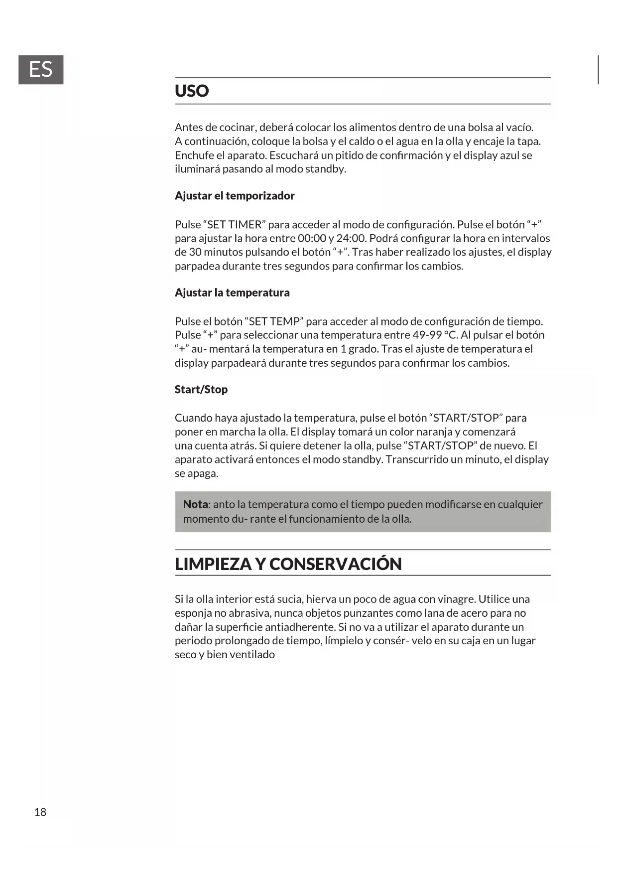 USO Antes de cocinar, deberá colocar los alimentos dentro de una bolsa al vacío. A continuación, coloque la bolsa y el caldo o el agua en la olla y encaje la tapa. Enchufe el aparato. Escuchará un pitido de conrmación y el display azul se iluminará pasando al modo standby. Ajustar el temporizador Pulse “SET TIMER” para acceder al modo de conguración. Pulse el botón “+” para ajustar la hora entre 00:00 y 24:00. Podrá congurar la hora en intervalos de 30 minutos pulsando el botón “+”. Tras haber realizado los ajustes, el display parpadea durante tres segundos para conrmar los cambios. Ajustar la temperatura Pulse el botón “SET TEMP” para acceder al modo de conguración de tiempo. Pulse “+” para seleccionar una temperatura entre 49-99 °C. Al pulsar el botón “+” au- mentará la temperatura en 1 grado. Tras el ajuste de temperatura el display parpadeará durante tres segundos para conrmar los cambios. Start/Stop Cuando haya ajustado la temperatura, pulse el botón “START/STOP” para poner en marcha la olla. El display tomará un color naranja y comenzará una cuenta atrás. Si quiere detener la olla, pulse “START/STOP” de nuevo. El aparato activará entonces el modo standby. Transcurrido un minuto, el display se apaga. Nota: anto la temperatura como el tiempo pueden modicarse en cualquier momento du- rante el funcionamiento de la olla.