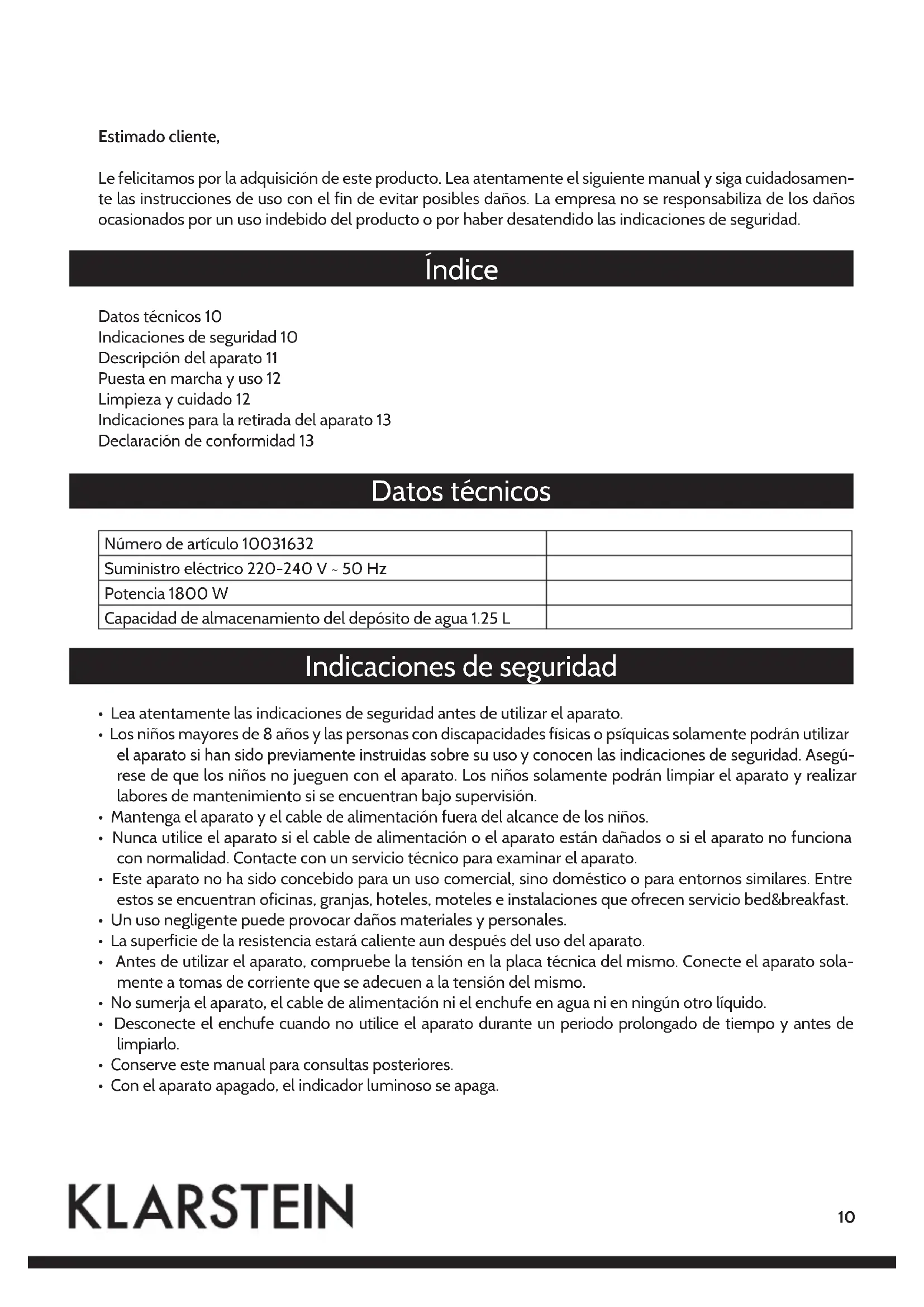 Apague el aparato después de que la mitad de la solución se haya filtrado. Deje que la solución actúe 10 minutos. 4 Continúe con el proceso pulsando de nuevo el botón on/off. Deje terminar el resto del ciclo. 5 Deje que el aparato se enfríe durante 5 minutos. 6 Repita los pasos 1-5 con agua fresca para retirar los restos del descalcificador. Indicaciones para la retirada del aparato Si el aparato lleva adherida la ilustración de la izquierda (el contenedor de basura tachado) entonces rige la normativa europea, directiva 2012/19/UE. Este producto no debe arrojar- se a un contenedor de basura común. Infórmese sobre las leyes territoriales que regulan la recogida separada de aparatos eléctricos y electrónicos. Respete las leyes territoriales y no arroje aparatos viejos al cubo de la basura doméstica. Una retirada de aparatos conforme a las leyes contribuye a proteger el medio ambiente y a las personas a su alrededor frente a posibles consecuencias perjudiciales para la salud. El reciclaje ayuda a reducir el consumo de materias primas. Declaración de conformidad Fabricante: Chal-Tec GmbH, Wallstraße 16, 10179 Berlín (Alemania). Este producto cumple con las siguientes directivas europeas: 2014/30/UE (EMC) 2014/35/UE (baja tensión) 2011/65/UE (refundición RoHS)14 Cher client, Toutes nos félicitations pour l’acquisition de ce nouvel appareil. Veuillez lire attentivement les instructions su- ivantes afin d’éviter d’éventuels dommages. Le fabricant ne saurait être tenu pour responsable des dommages dus au non-respect des consignes de sécurité et à la mauvaise utilisation de l’appareil. Sommaire Fiche technique 14 Consignes de sécurité 14 Aperçu de l’appareil 15 Mise en service et utilisation 16 Nettoyage et entretien 16 Conseils pour le recyclage 17 Déclaration de conformité 17 Fiche technique Numéro d’article 10031632 Alimentation 220-240 V ~ 50 Hz Puissance 1800 W Contenance du réservoir d’eau 1.25 L Consignes de sécurité