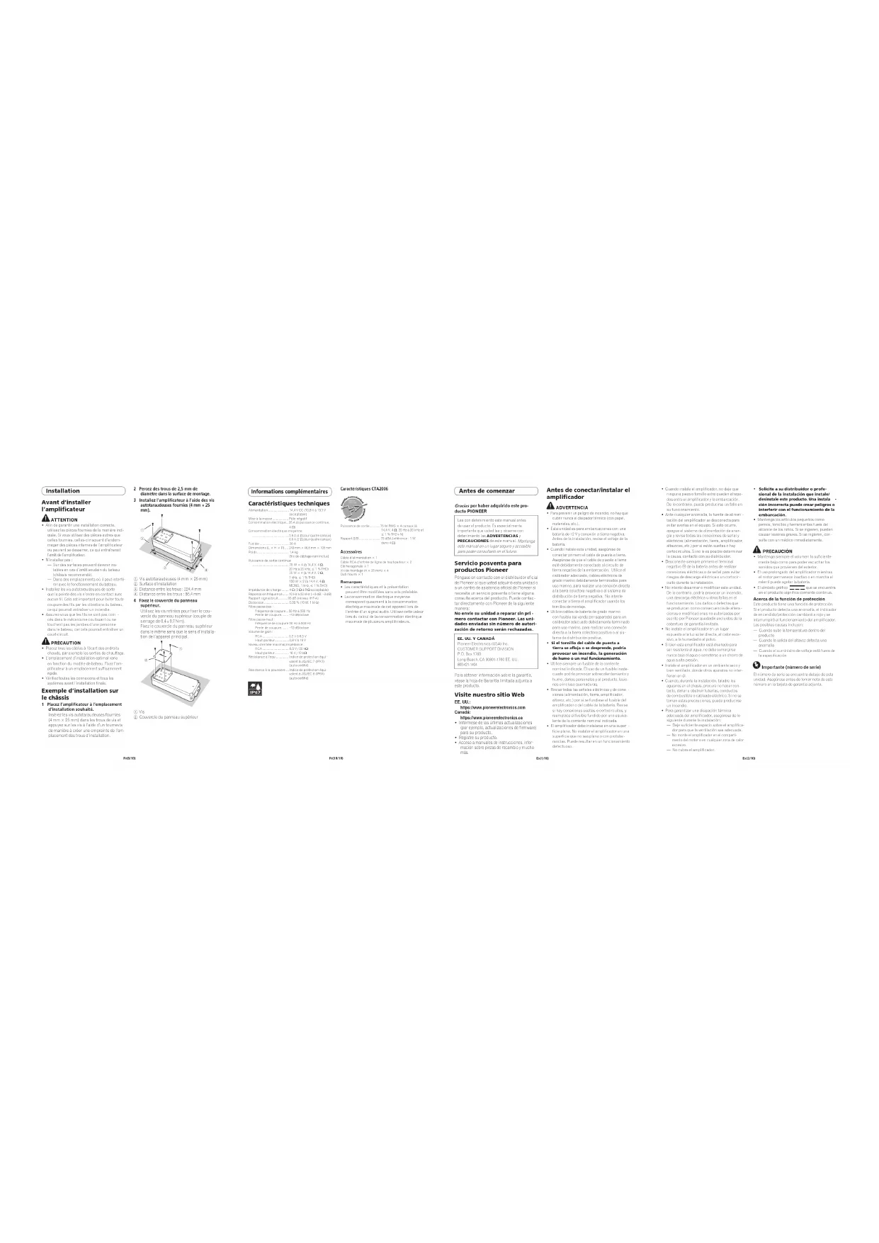 Antes de conectar/instalar el amplicador ADVERTENCIA Para prevenir un peligro de incendio, no hay que cubrir nunca el disipador térmico (con papel, materiales, etc.). Esta unidad es para embarcaciones con una batería de 12 V y conexión a tierra negativa. Antes de la instalación, revise el voltaje de la batería. Cuando instale esta unidad, asegúrese de conectar primero el cable de puesta a tierra. Asegúrese de que el cable de puesta a tierra esté debidamente conectado al circuito de tierra negativa de la embarcación. Utilice el calibrador adecuado, cables eléctricos de grado marino debidamente terminados para uso marino, para realizar una conexión directa a la barra colectora negativa o al sistema de distribución de tierra negativa. No intente conectar a tierra el amplificador usando los tornillos de montaje. Utilice cables de batería de grado marino con fusible (se vende por separado) para un calibrador adecuado debidamente terminado para uso marino, para realizar una conexión directa a la barra colectora positiva o al sis tema de distribución positiva. Si el tornillo del cable de puesta a tierra se aoja o se desprende, podría provocar un incendio, la generación de humo o un mal funcionamiento. Utilice siempre un fusible de la corriente nominal indicada. El uso de un fusible inade cuado podría provocar sobrecalentamiento y umo, daños personales y al producto, lesio nes e incluso quemaduras. Revise todas las señales eléctricas y de cone xiones (alimentación, tierra, amplificador, altavoz, etc.) por si se fundiese el fusible del amplificador o del cable de la batería. Revise si hay conexiones sueltas o cortocircuitos, y reemplace el fusible fundido por uno equiva lente de la corriente nominal indicada. El amplificador debe instalarse en una super ficie plana. No instalar el amplificador en una superficie que no sea plana o con protube rancias. Puede resultar en un funcionamiento defectuoso. Cuando instale el amplificador, no deje que ninguna pieza o tornillo extra queden atrapa dos entre el amplificador y la embarcación. e lo contrario, puede producirse un fallo en su funcionamiento. Ante cualquier anomalía, la fuente de alimen tación del amplificador se desconecta para evitar averías en el equipo. Si esto ocurre, apague el sistema de alimentación de ener gía y revise todas las conexiones de señal y léctricas (alimentación, tierra, amplificador, altavoces, etc.) por si están sueltas o hay cortocircuitos. Si no le es posible determinar la causa, contacte con su distribuidor. Desconecte siempre primero el terminal negativo * de la batería antes de realizar conexiones eléctricas o de señal para evitar riesgos de descarga eléctrica o un cortocir cuito durante la instalación. No intente desarmar o modificar esta unidad. De lo contrario, podría provocar un incendio, una descarga eléctrica u otros fallos en el funcionamiento. Los daños o defectos que se produzcan como consecuencia de altera ciones o modificaciones no autorizadas por escrito por Pioneer quedarán excluidos de la cobertura de garantía limitada. No instale el amplificador en un lugar expuesto a la luz solar directa, al calor exce sivo, a la humedad o al polvo. Si bien este amplificador está diseñado para ser resistente al agua, no debe sumergirse nunca bajo el agua o someterse a un chorro de agua a alta presión. Instale el amplificador en un ambiente seco y bien ventilado, donde otros aparatos no inter-fieran en él. Cuando, durante la instalación, taladre los agujeros en el chasis, procure no hacer con-tacto, dañar u obstruir tuberías, conductos de combustible o cableado eléctrico. Si no se toman estas precauciones, puede producirse un incendio. Para garantizar una disipación térmica adecuada del amplificador, asegúrese de lo siguiente durante la instalación: — Deje suficiente espacio sobre el amplifica- dor para que la ventilación sea adecuada.— No monte el amplificador en el comparti-mento del motor o en cualquier zona de calor excesivo.— No cubra el amplificador. Solicite a su distribuidor o profe- sional de la instalación que instale/ esinstale este producto. Una instala ción incorrecta puede crear peligros o interferir con el funcionamiento de la embarcación. Mantenga los artículos pequeños como pernos, tornillos y herramientas fuera del alcance de los niños. Si se ingieren, pueden causar lesiones graves. Si se ingieren, con sulte con un médico inmediatamente. PRECAUCIÓN Mantenga siempre el volumen lo suficiente-mente bajo como para poder escuchar los onidos que provienen del exterior. El uso prolongado del amplificador mientras el motor permanece inactivo o en marcha al ralentí puede agotar la batería. El símbolo gráfico que se encuentra en el producto significa corriente continua. Acerca de la función de protección Este producto tiene una función de protección. Si el producto detecta una anomalía, el indicador de encendido/protección cambiará a rojo y se interrumpirá el funcionamiento del amplificador.Las posibles causas incluyen:— Cuando sube la temperatura dentro del producto— Cuando la salida del altavoz detecta una anomalía— Cuando el suministro de voltaje está fuera de la especificación Importante (número de serie) El número de serie se encuentra debajo de esta unidad. Asegúrese antes de tomar nota de este número en la tarjeta de garantía adjunta.A1-000030-9L-A.indd 21-24 2020/11/04 10:33:05E s(6/10)<A1-000030-9L-A> 28E s(5/10)<A1-000030-9L-A> 27Es(4/10)<A1-000030-9L-A> 26E s(3/10)<A1-000030-9L-A> 25 puede regular la salida de la unidad central al amplificador Pioneer. La posición prede- finida es NO R (normal). Si la salida permanece baja, incluso cuando se sube el volumen de la unidad central, baje el volumen de GAIN (sentido horario). Si se produce una distorsión cuando se sube el volumen de la unidad central, suba el volumen de GAIN (sentido antihorario). Si solo utiliza un conector de entrada, ponga los volúmenes de gan