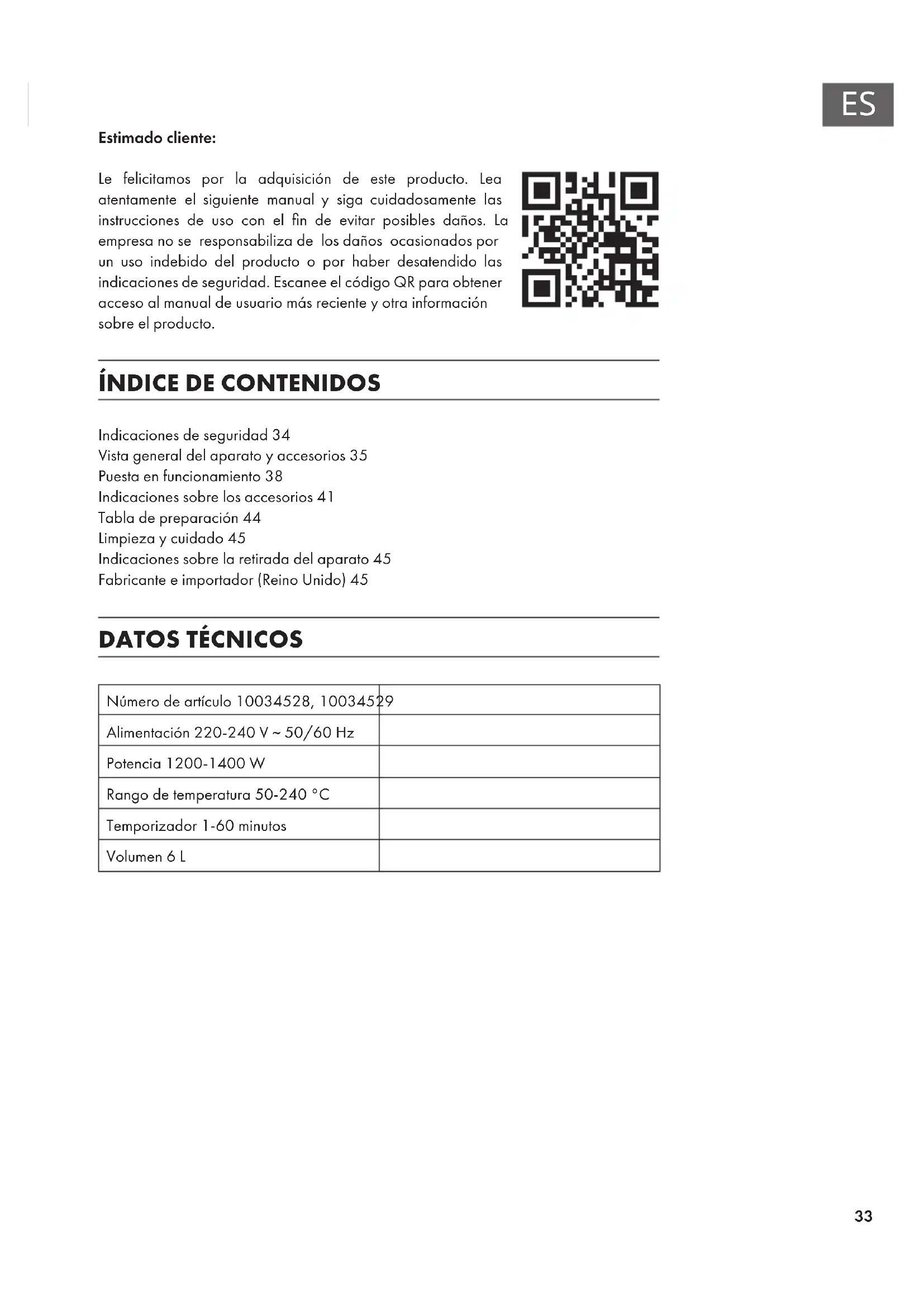 Indicaciones de seguridad34 Vista general del aparato y accesorios35 Puesta en funcionamiento38 Indicaciones sobre los accesorios41 Tabla de preparación44 Limpieza y cuidado45 Indicaciones sobre la retirada del aparato45 Fabricante e importador (Reino Unido)45